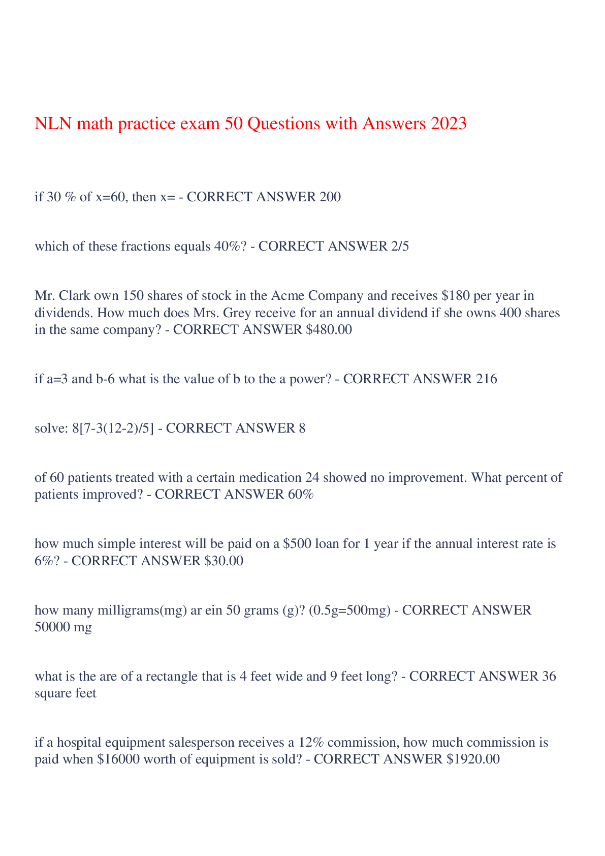 Education > EXAM > NLN math practice exam 50 Questions with Answers 2023,100% CORRECT (All)