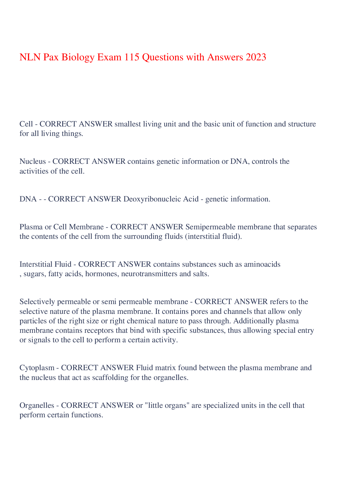 Education > EXAM > NLN Pax Biology Exam 115 Questions with Answers 2023,100% CORRECT (All)