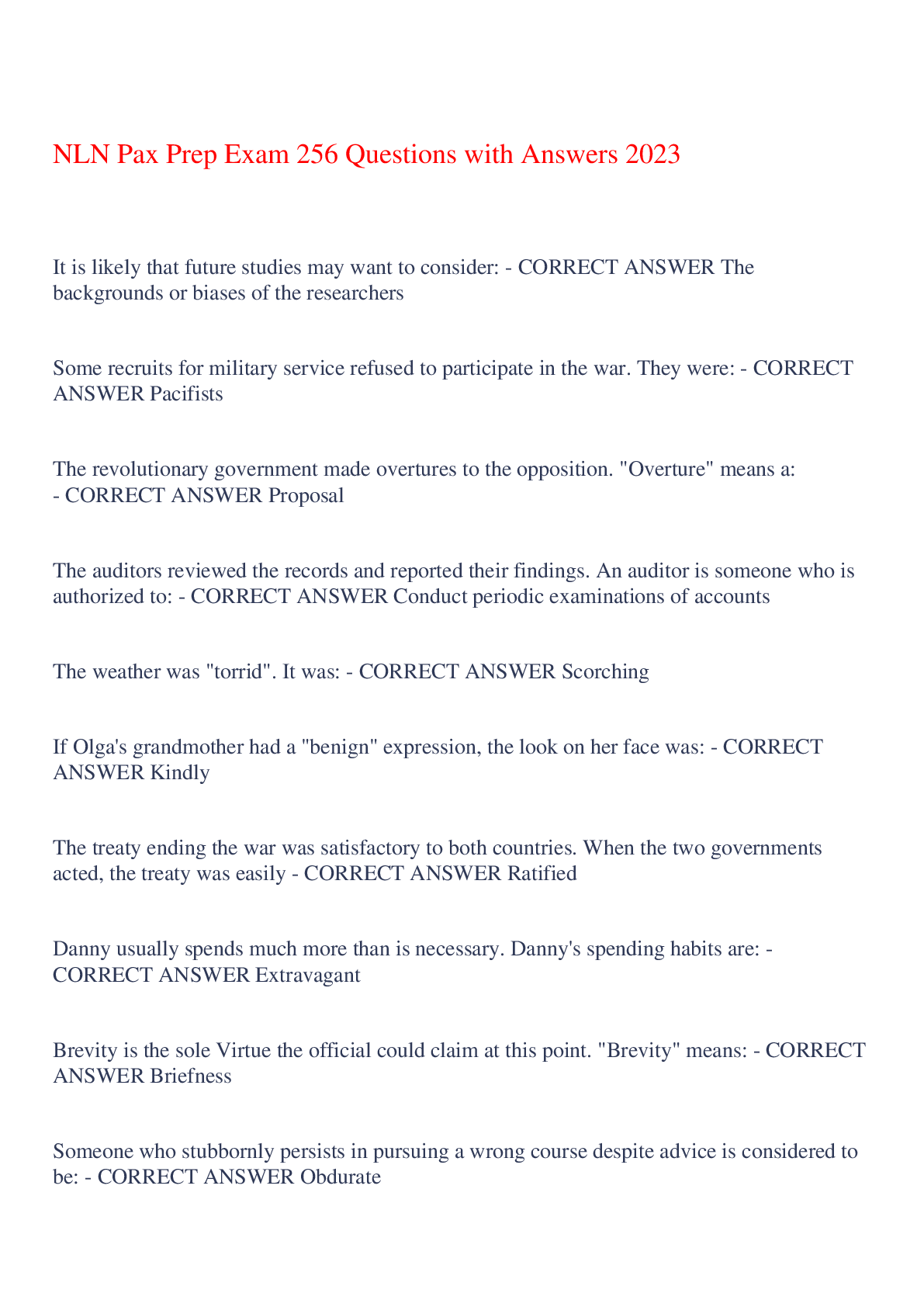 Education > EXAM > NLN Pax Prep Exam 256 Questions with Answers 2023,100% CORRECT (All)