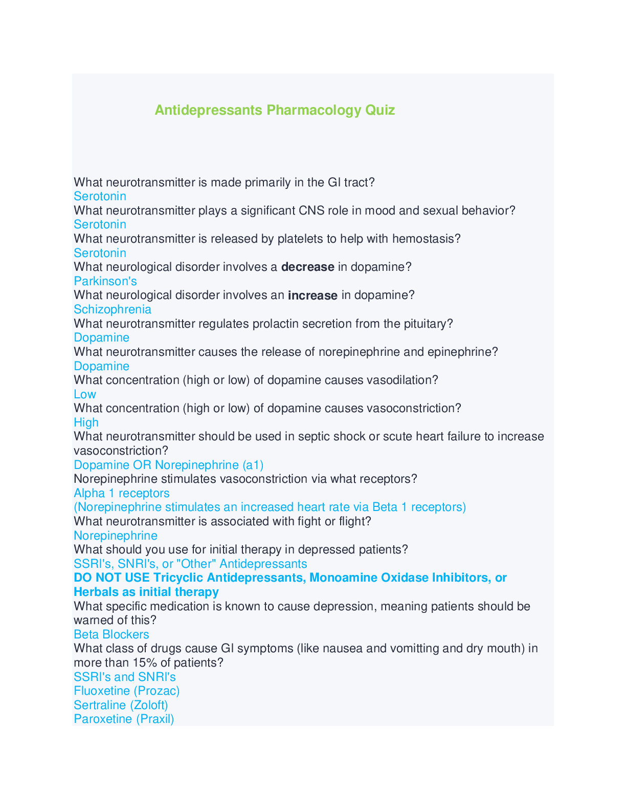 Education > EXAM > Antidepressants Pharmacology Questions and answers Rated A complete solution 2024/2025 (All)