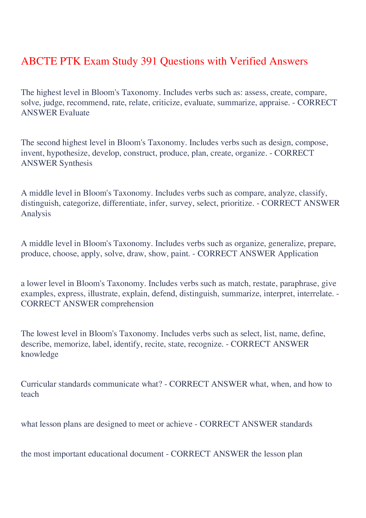 Education > EXAM > ABCTE PTK Overview Exam 77 Questions with Verified Answers,100% CORRECT (All)