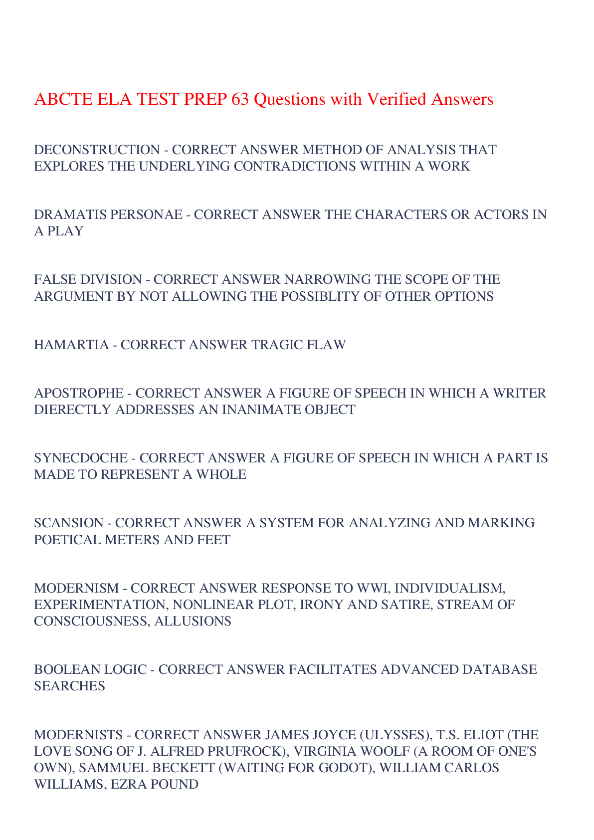 Education > EXAM > ABCTE ELA TEST PREP 63 Questions with Verified Answers,100% CORRECT (All)