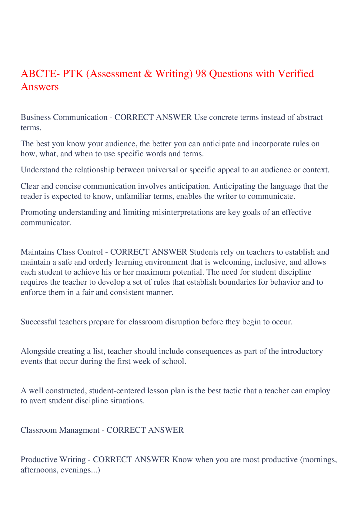 Education > EXAM > ABCTE- PTK (Assessment & Writing) 98 Questions with Verified Answers,100% CORRECT (All)