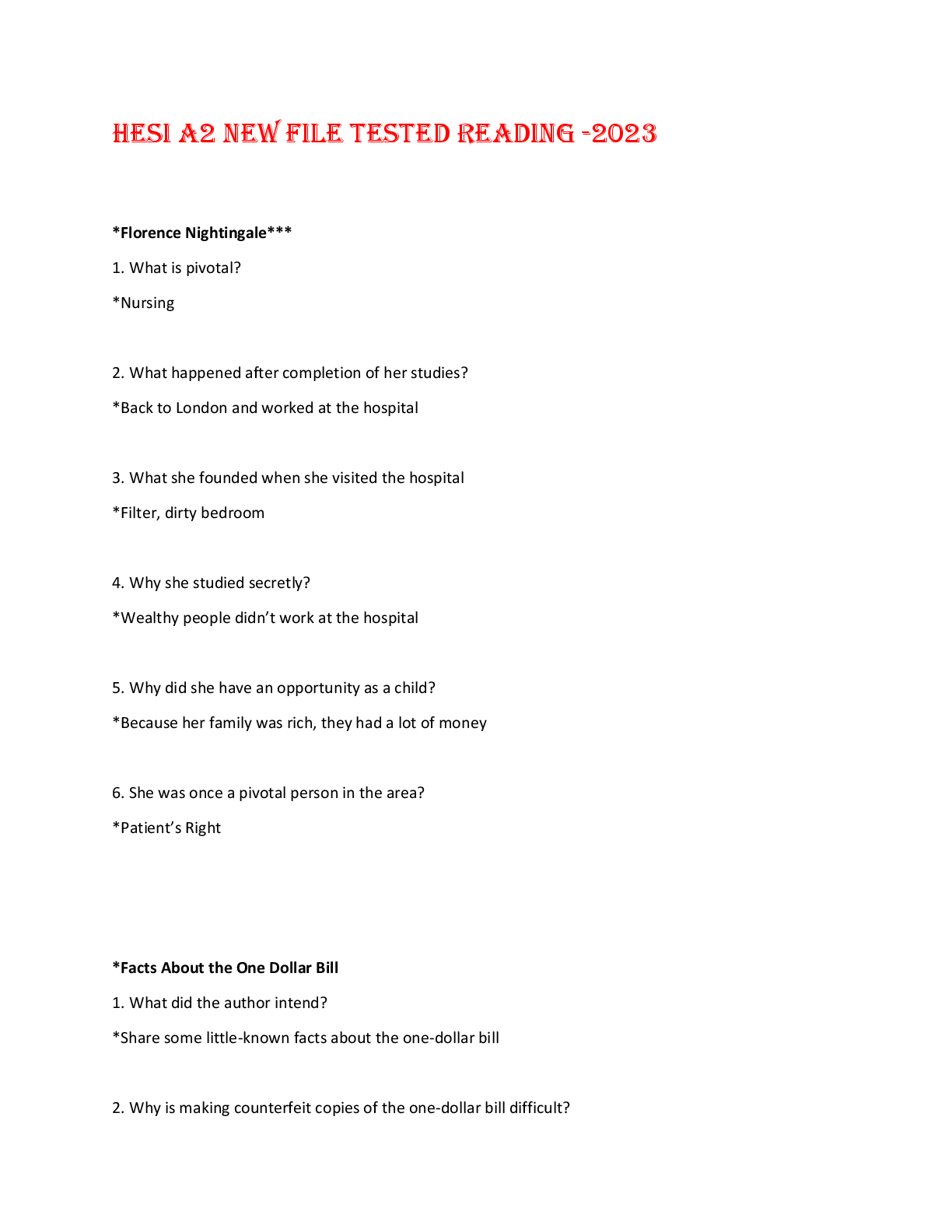Education > EXAM > HESI A2 NEW FILE TESTED AND VERIFIED READING EXAM 2025 (All)