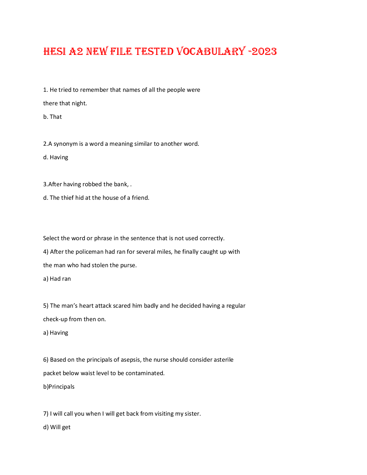 Education > EXAM > HESI A2 NEW FILE VOCABULARY EXAM TESTED AND VERIFIED LATEST UPDATE 2025 (All)