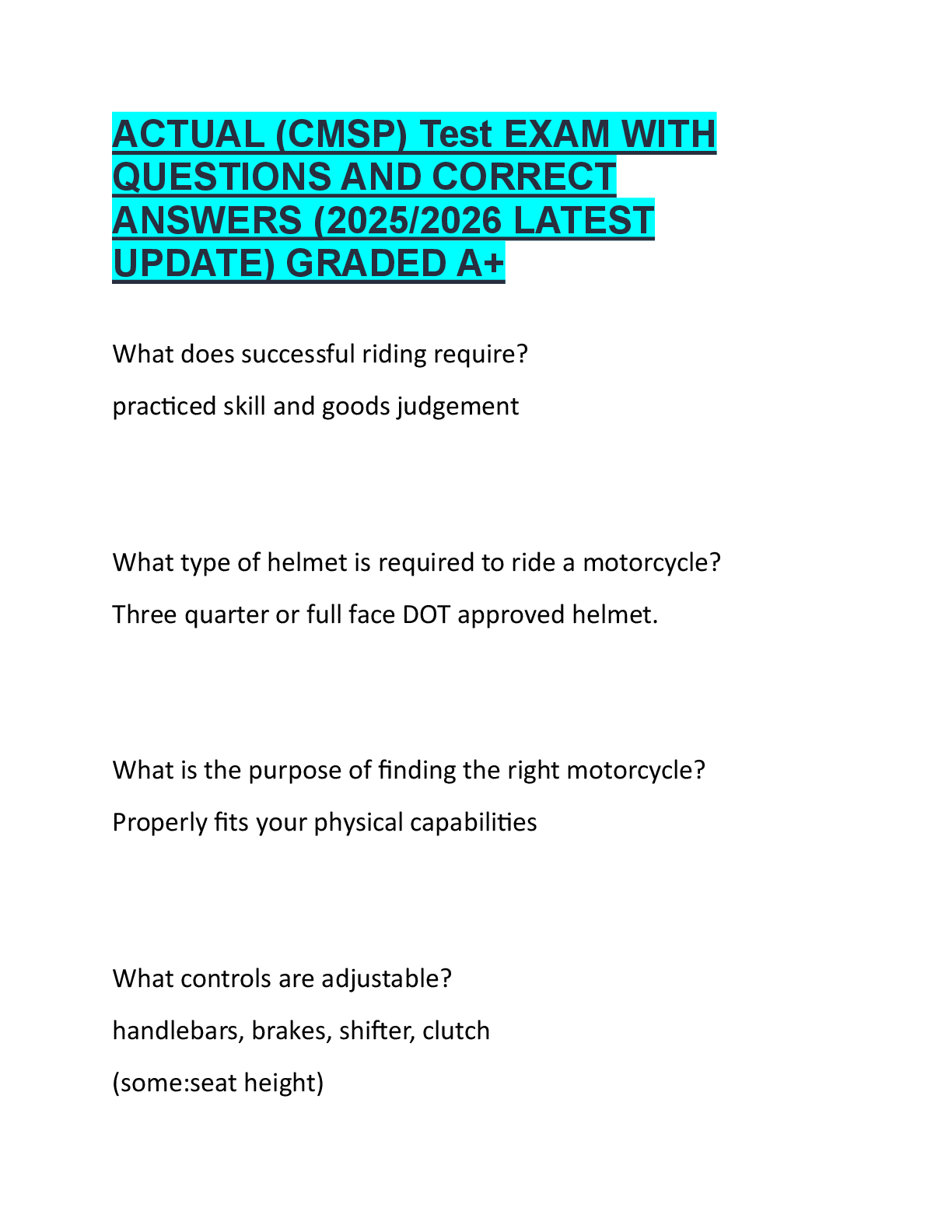 Education > EXAM > ACTUAL (CMSP) Test EXAM WITH QUESTIONS AND CORRECT ANSWERS (2025/2026 LATEST UPDATE) GRADED A+ (All)