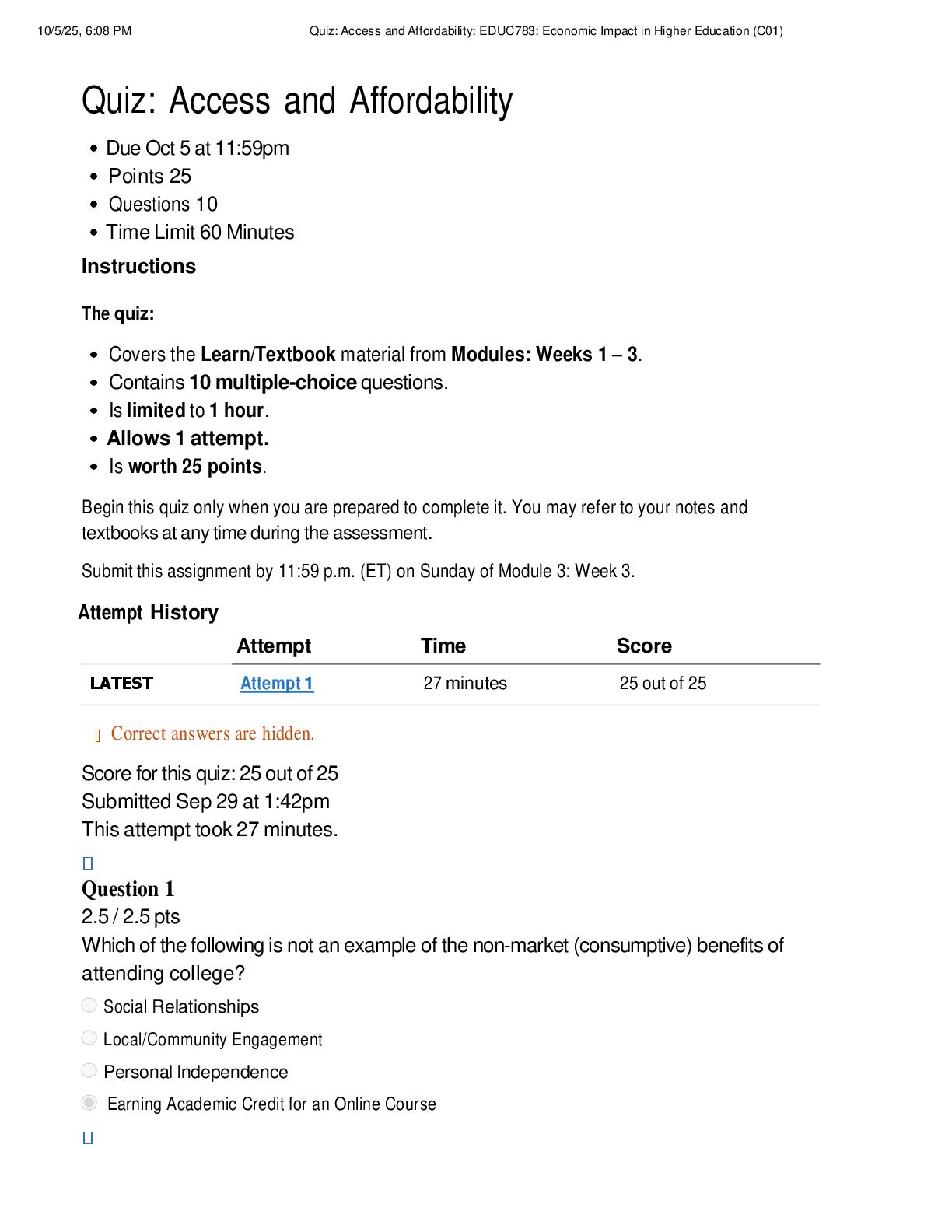 Education > EXAM > EDUC 783 Quiz: Access and Affordability | Score 25/25 | Liberty University (All)