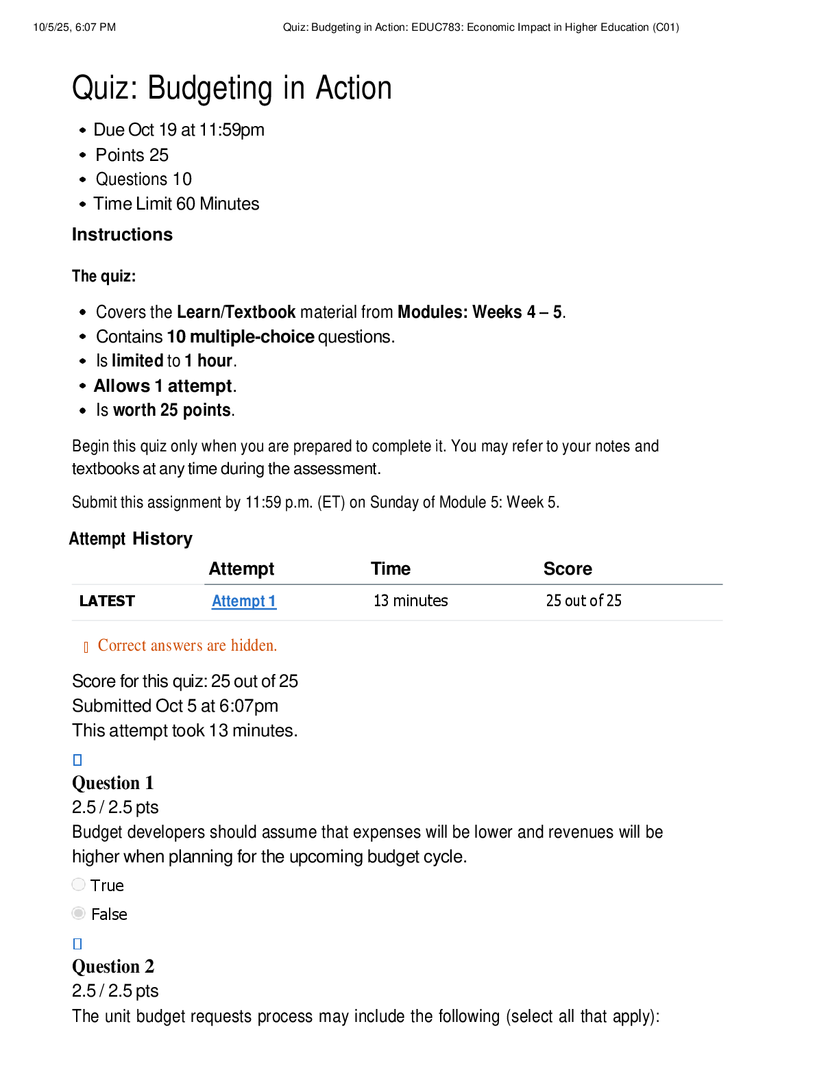 Education > EXAM > EDUC 783 Quiz: Budgeting in Action | Score 25/25 | Liberty University (All)