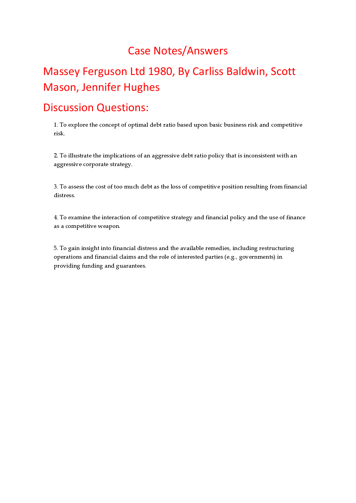 Education > HARVARD CASE SOLUTIONS > Case Notes Answers for Massey Ferguson Ltd 1980, By Carliss Baldwin, Scott Mason, Jennifer Hughes (All)
