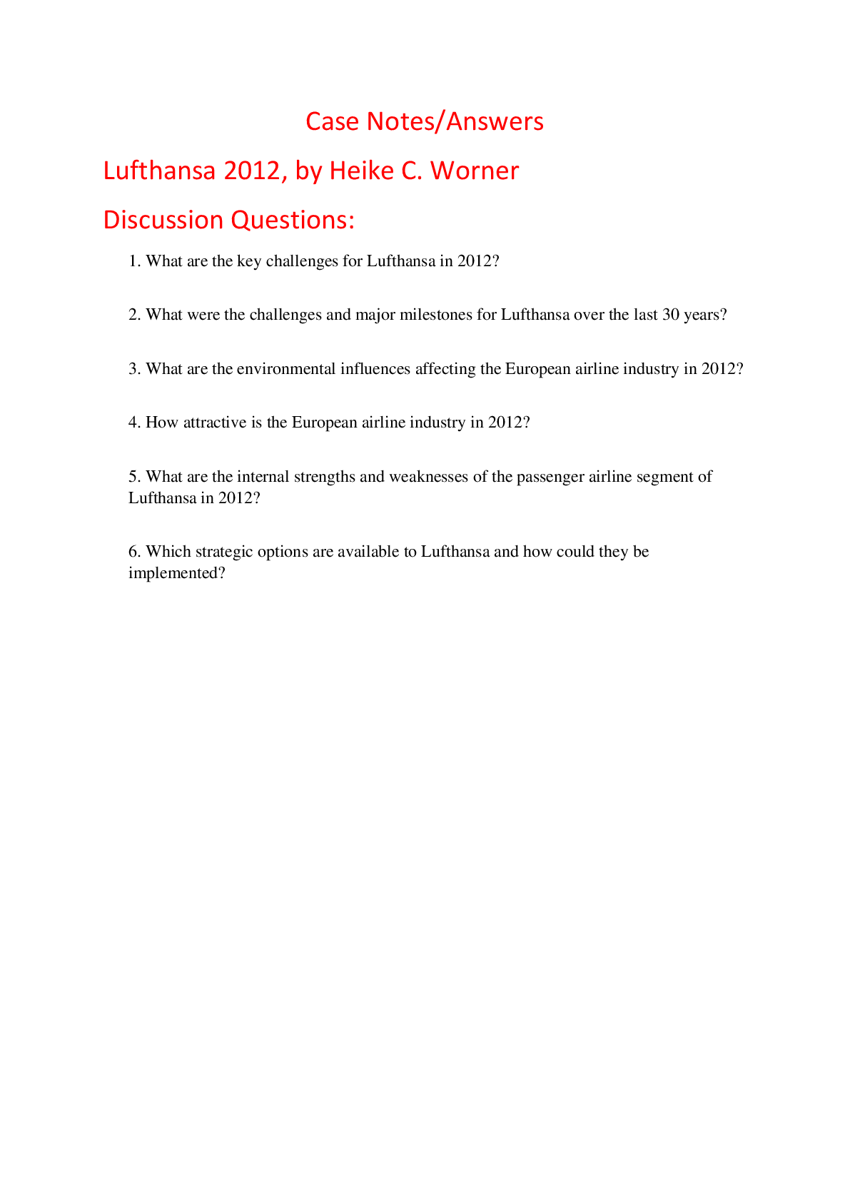 Education > HARVARD CASE SOLUTIONS > Case Notes Answers for Lufthansa 2012, by Heike C. Worner (All)