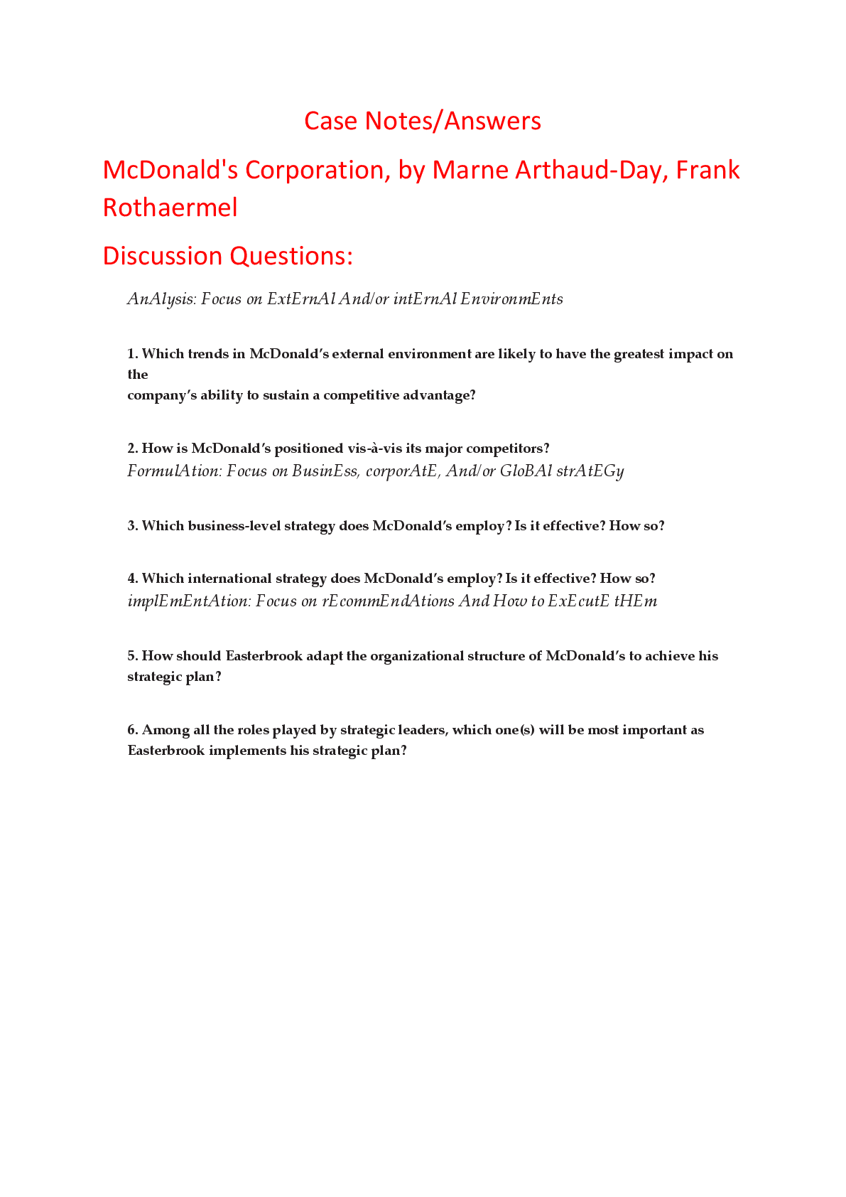 Education > HARVARD CASE SOLUTIONS > Case Notes Answers for McDonald's Corporation, by Marne Arthaud-Day, Frank Rothaermel (All)