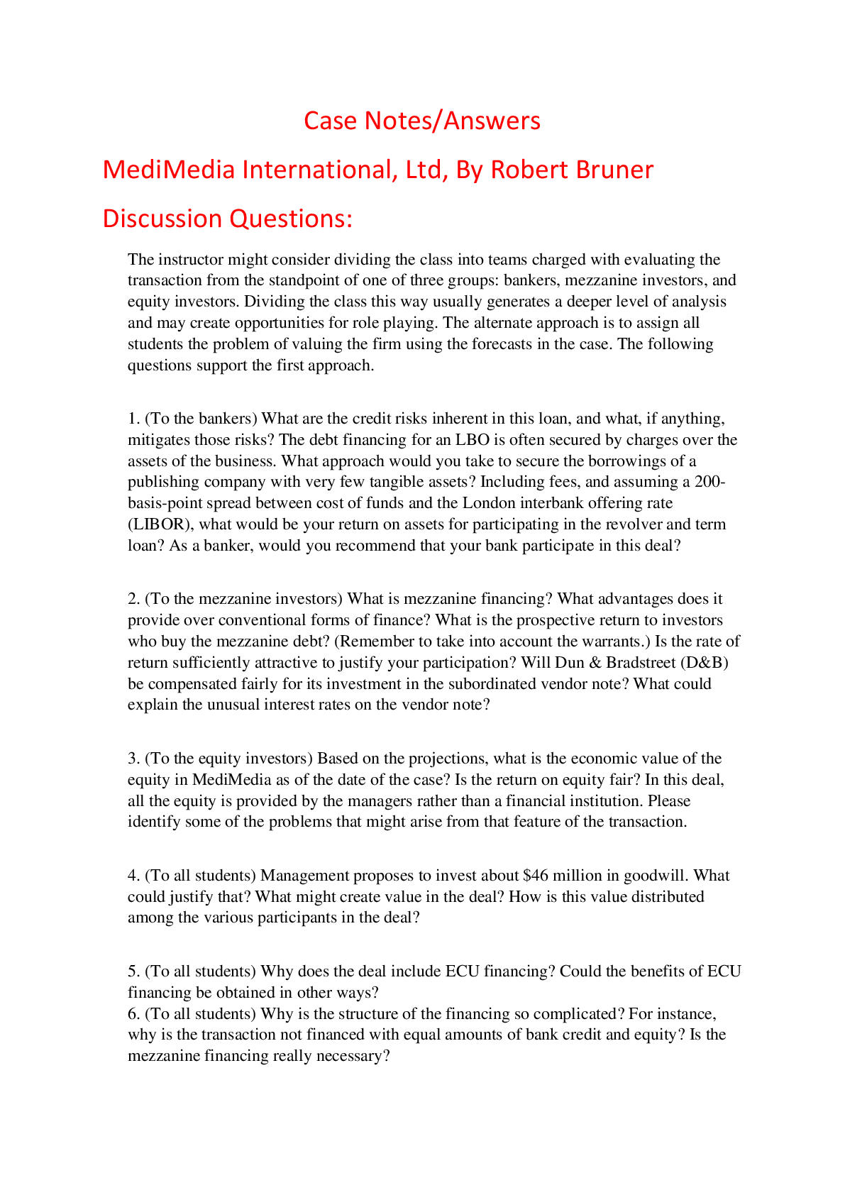 Education > HARVARD CASE SOLUTIONS > Case Notes Answers for MediMedia International, Ltd, By Robert Bruner (All)