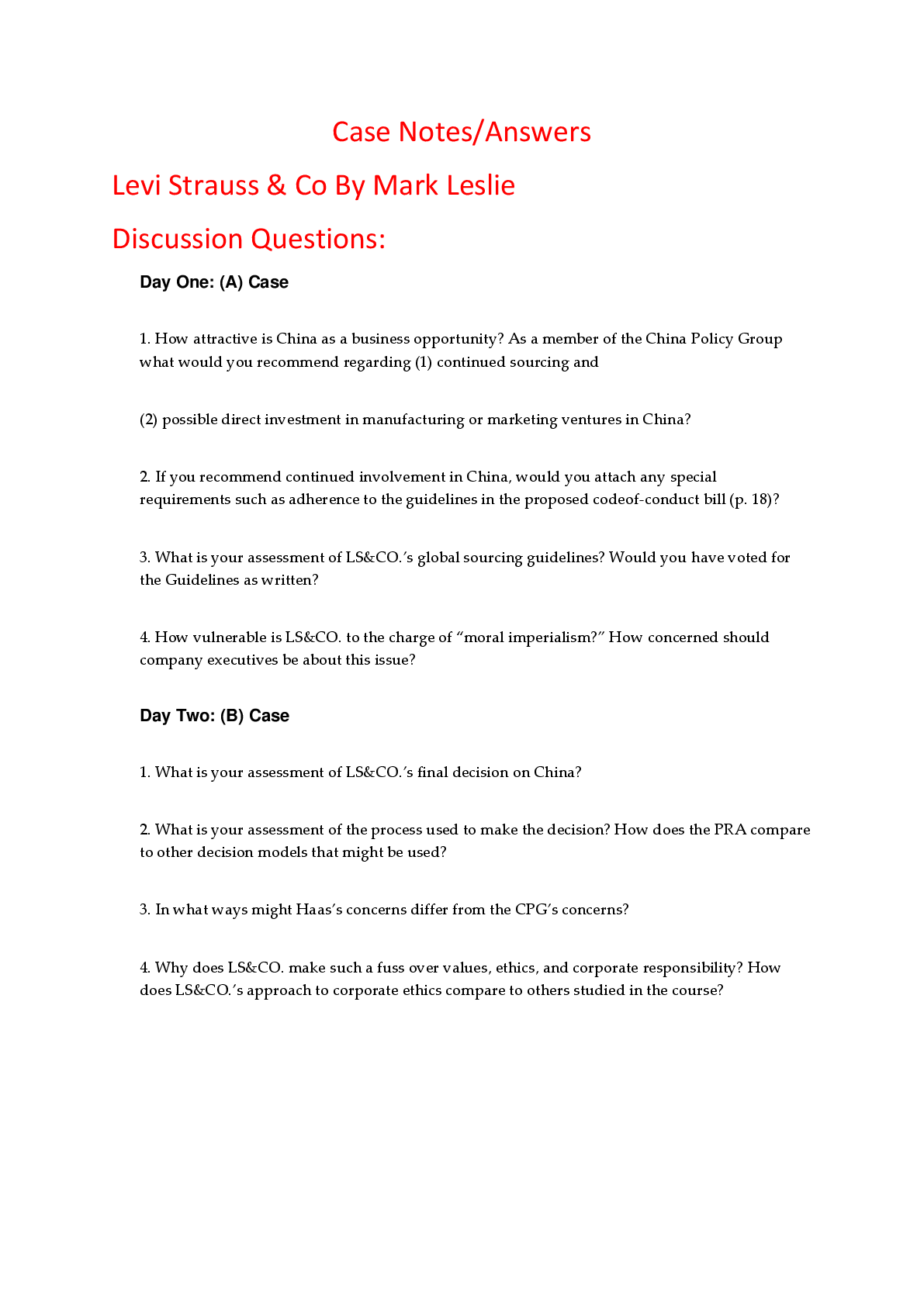 Education > HARVARD CASE SOLUTIONS > Case Notes Answers for Levi Strauss & Co By Mark Leslie (All)
