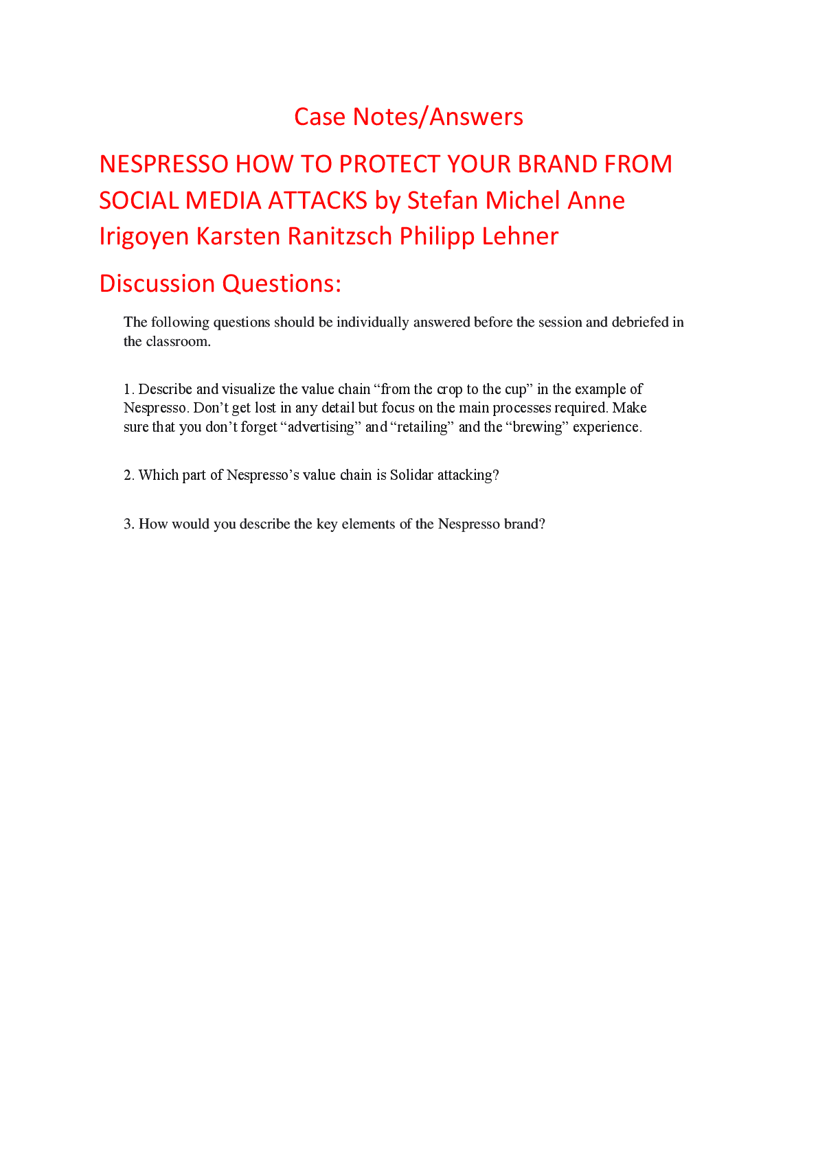 Education > HARVARD CASE SOLUTIONS > Case Notes Answers for NESPRESSO HOW TO PROTECT YOUR BRAND FROM SOCIAL MEDIA ATTACKS by Stefan Michel Anne Irigoyen Karsten Ranitzsch Philipp Lehner (All)