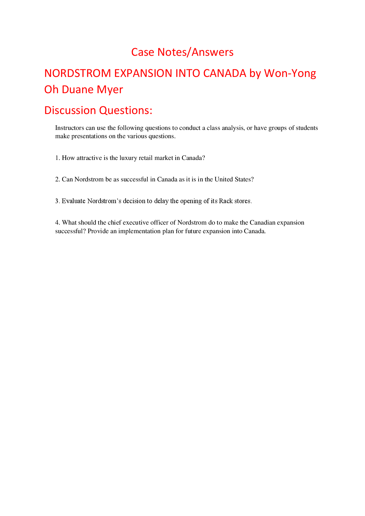 Education > HARVARD CASE SOLUTIONS > Case Notes Answers for NORDSTROM EXPANSION INTO CANADA by Won-Yong Oh Duane Myer (All)