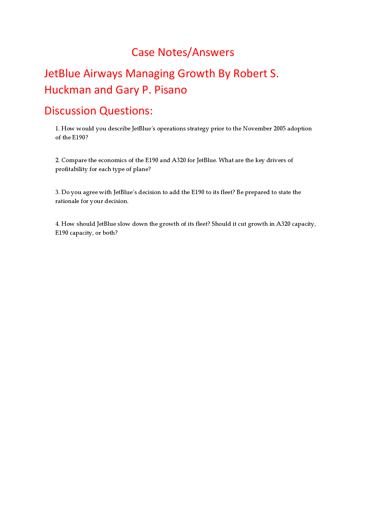 Education > HARVARD CASE SOLUTIONS > Case Notes Answers for JetBlue Airways Managing Growth By Robert S. Huckman and Gary P. Pisano (All)