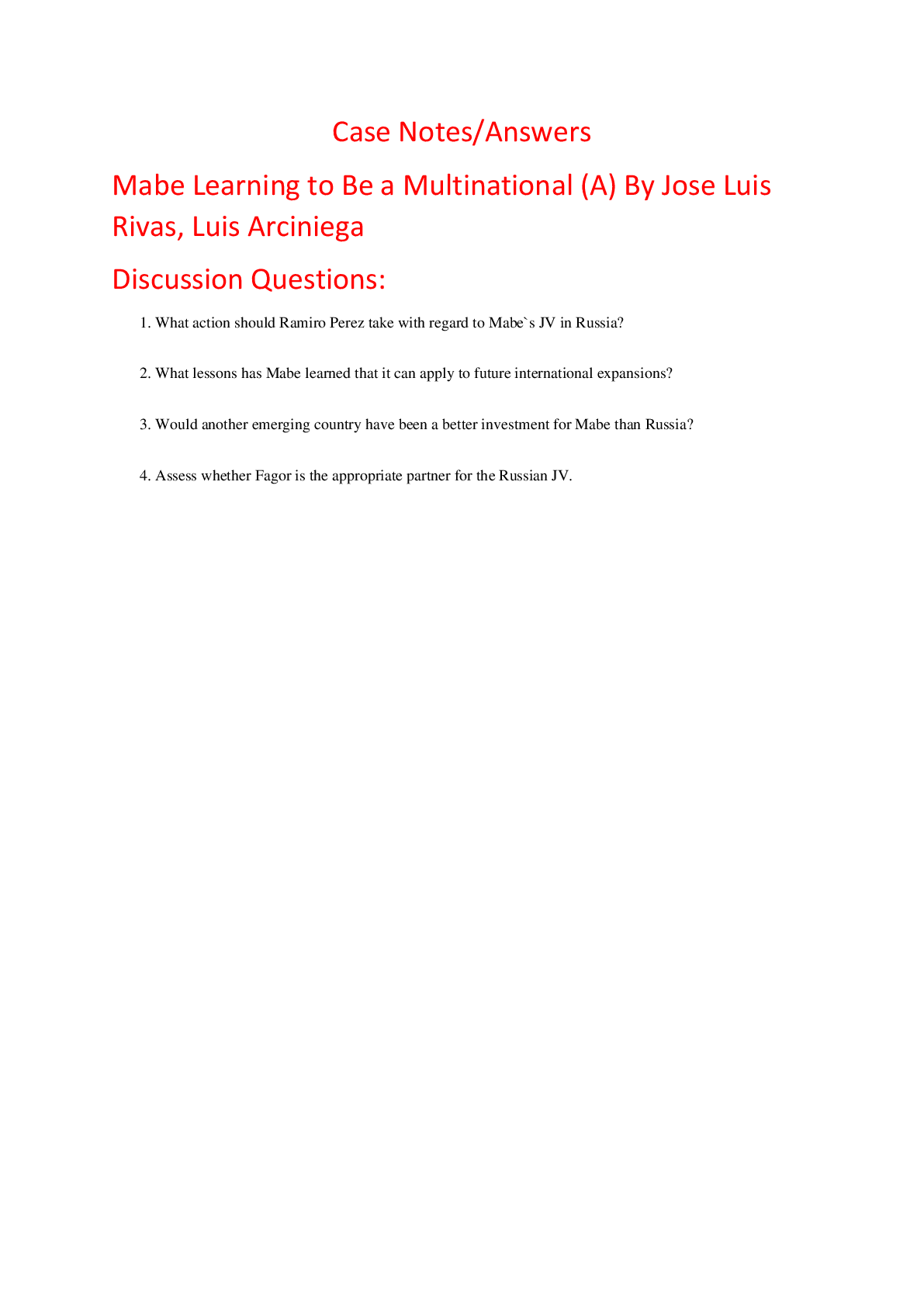 Education > HARVARD CASE SOLUTIONS > Case Notes Answers for Mabe Learning to Be a Multinational (A) By Jose Luis Rivas, Luis Arciniega (All)