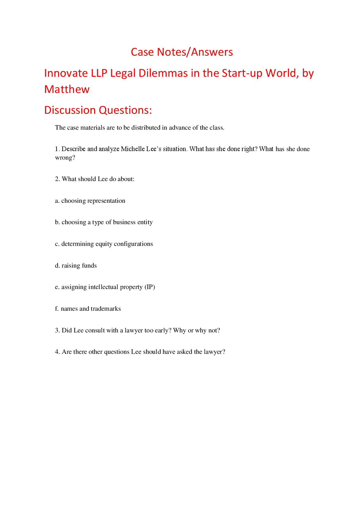 Education > HARVARD CASE SOLUTIONS > Case Notes Answers for Innovate LLP Legal Dilemmas in the Start-up World, by Matthew (All)