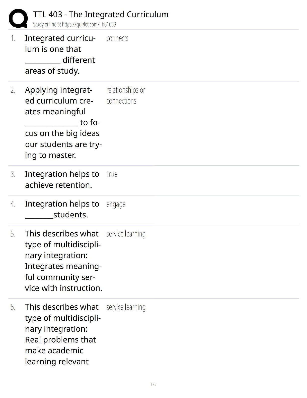Education > QUESTIONS & ANSWERS > TTL 403 – The Integrated Curriculum / Exam Prep / 2025 Update / Test Bank + Study Guide / Assignments / Score 100% / New Version (All)