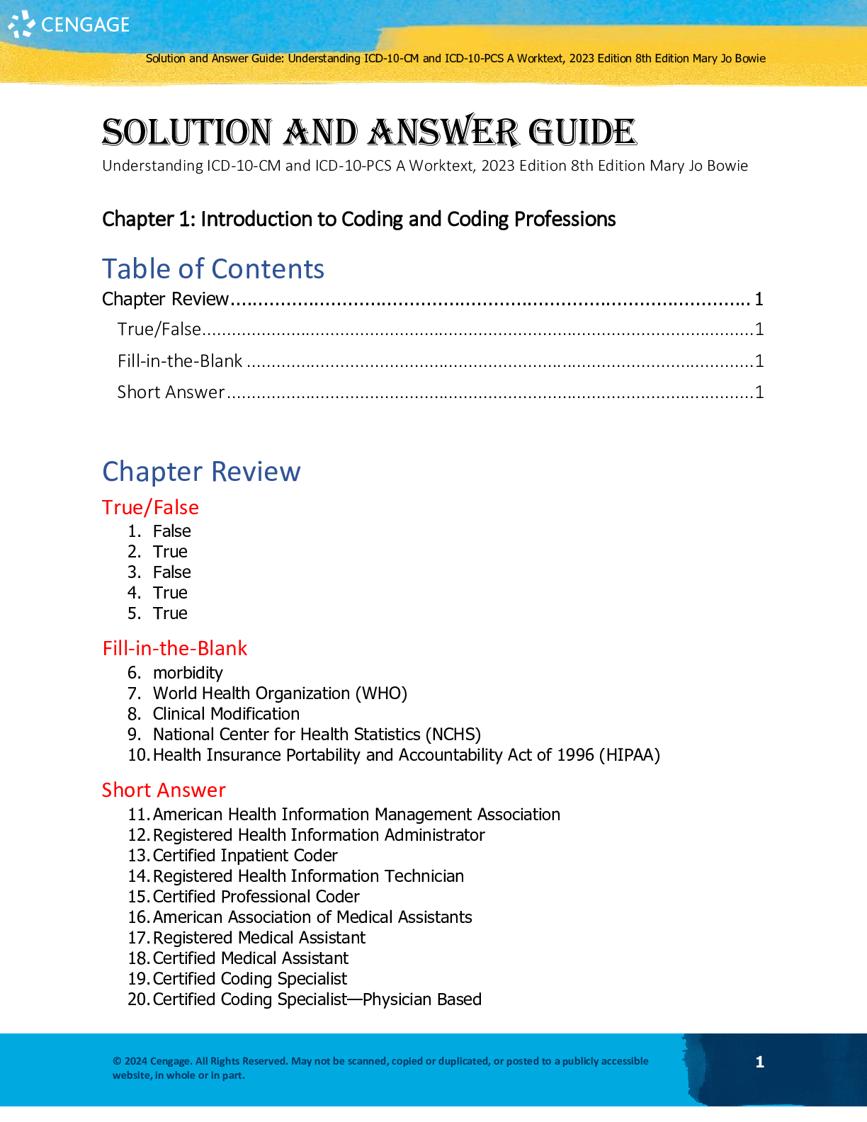 Education > SOLUTIONS MANUAL > Solution Manual For Understanding ICD-10-CM and ICD-10-PCS A Worktext, 2023 Edition 8th Edition by Mary Jo Bowie Chapter 1-38 (All)