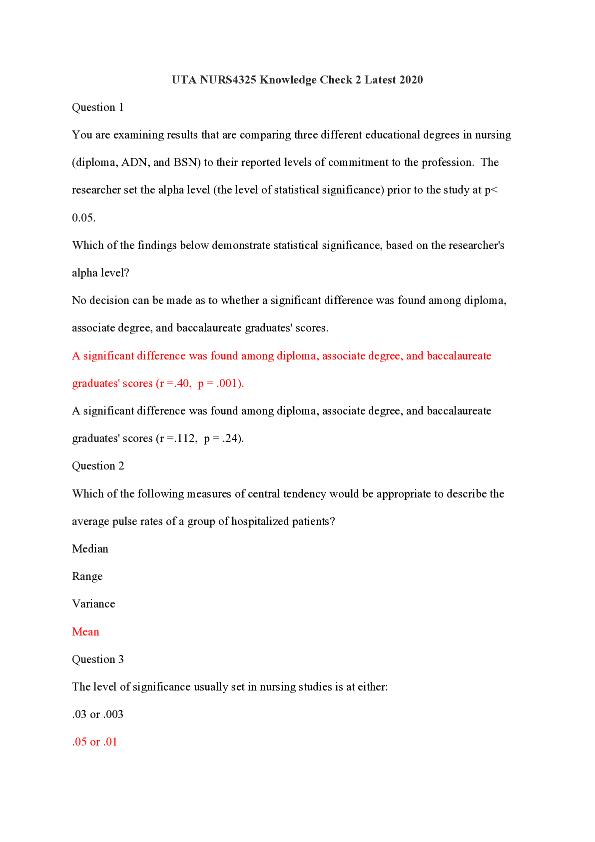 Education > EXAM > UTA NURS4325 Knowledge Check 2 (New) 2020 (All)
