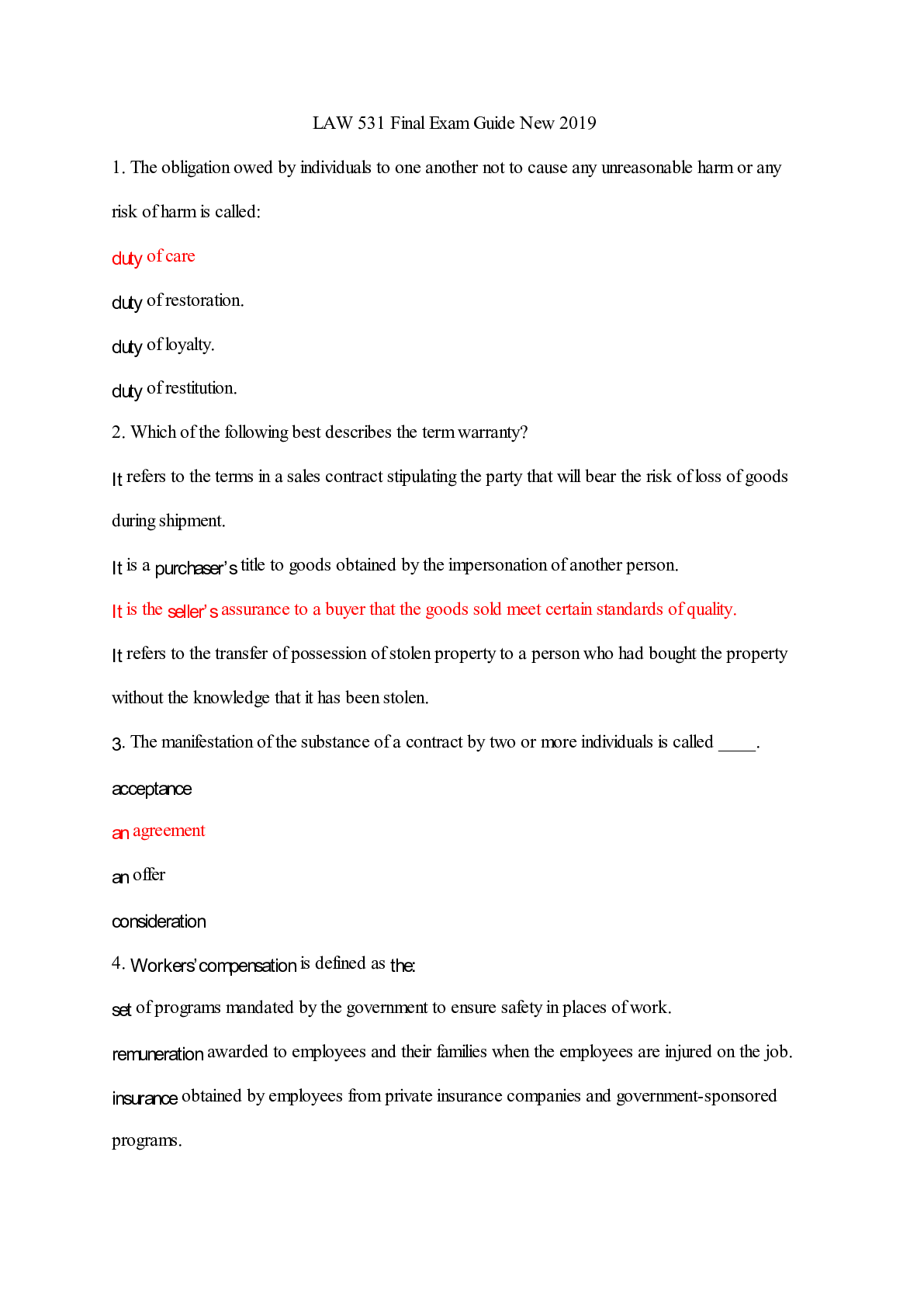 Education > EXAM > LAW 531 Final Exam Guide New 2019/LAW 531 Final Exam Guide New 2019 (All)