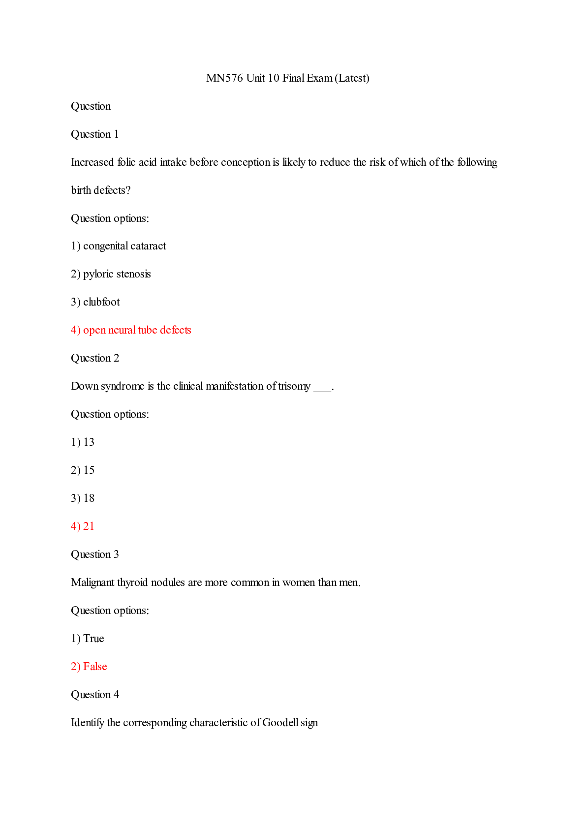 Education > EXAM > MN576 Unit 10 Final Exam (Latest) 51 questions (All)