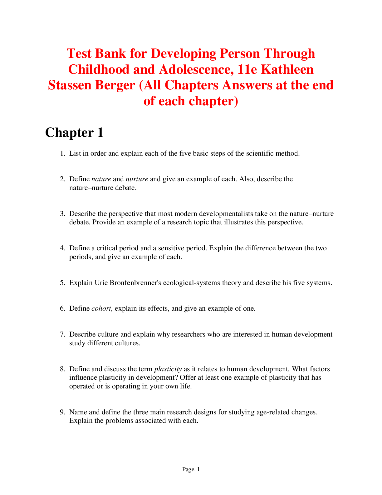 Education > TEST BANKS > Developing Person Through Childhood and Adolescence, 11e by Kathleen Berger (Test Bank) (All)
