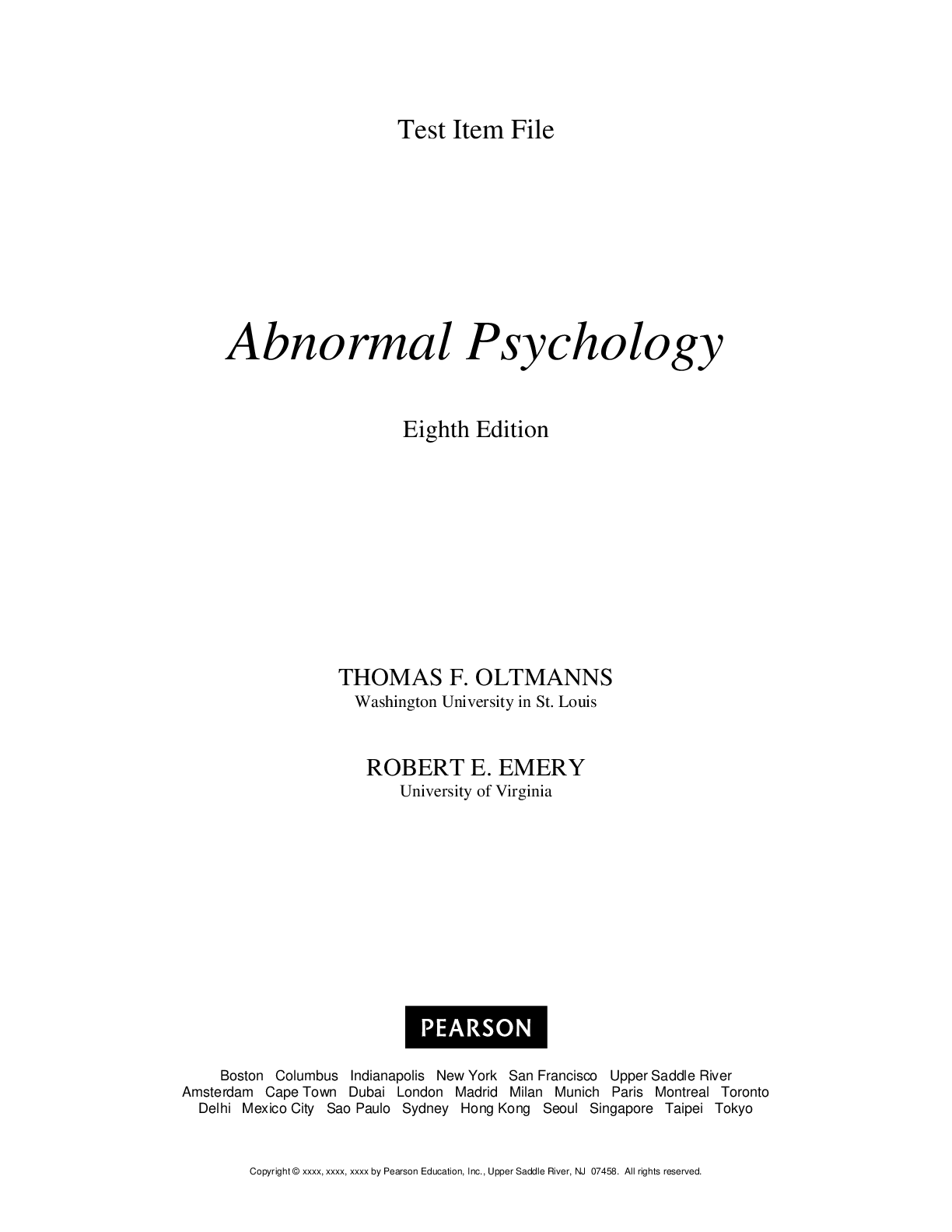 Education > TEST BANKS > Test Bank for Abnormal Psychology, 8E Thomas F. Oltmanns Robert E. Emery (All)