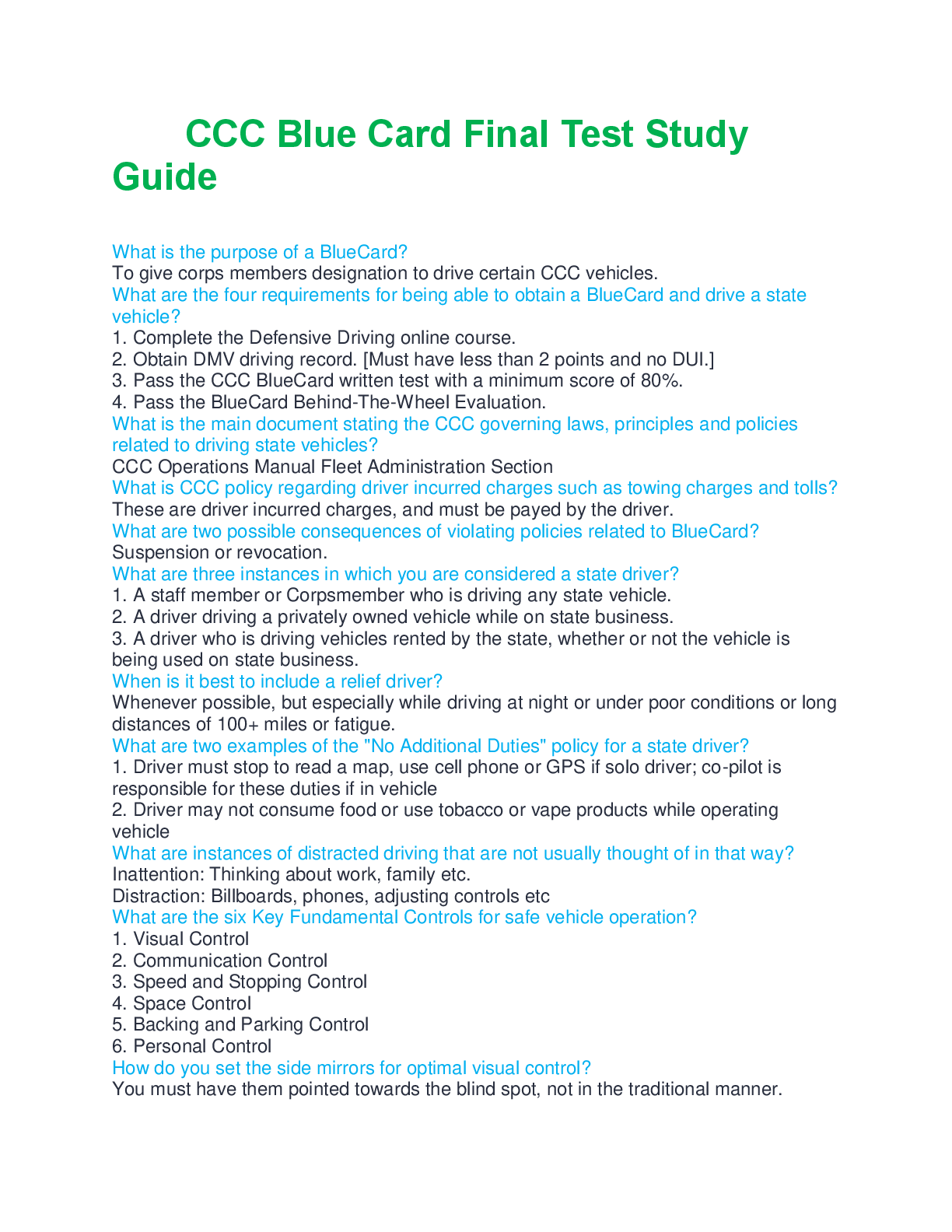 Education > EXAM > CCC Blue Card Final Test Study Guide questions and answers 100% complete solution 2025 (All)