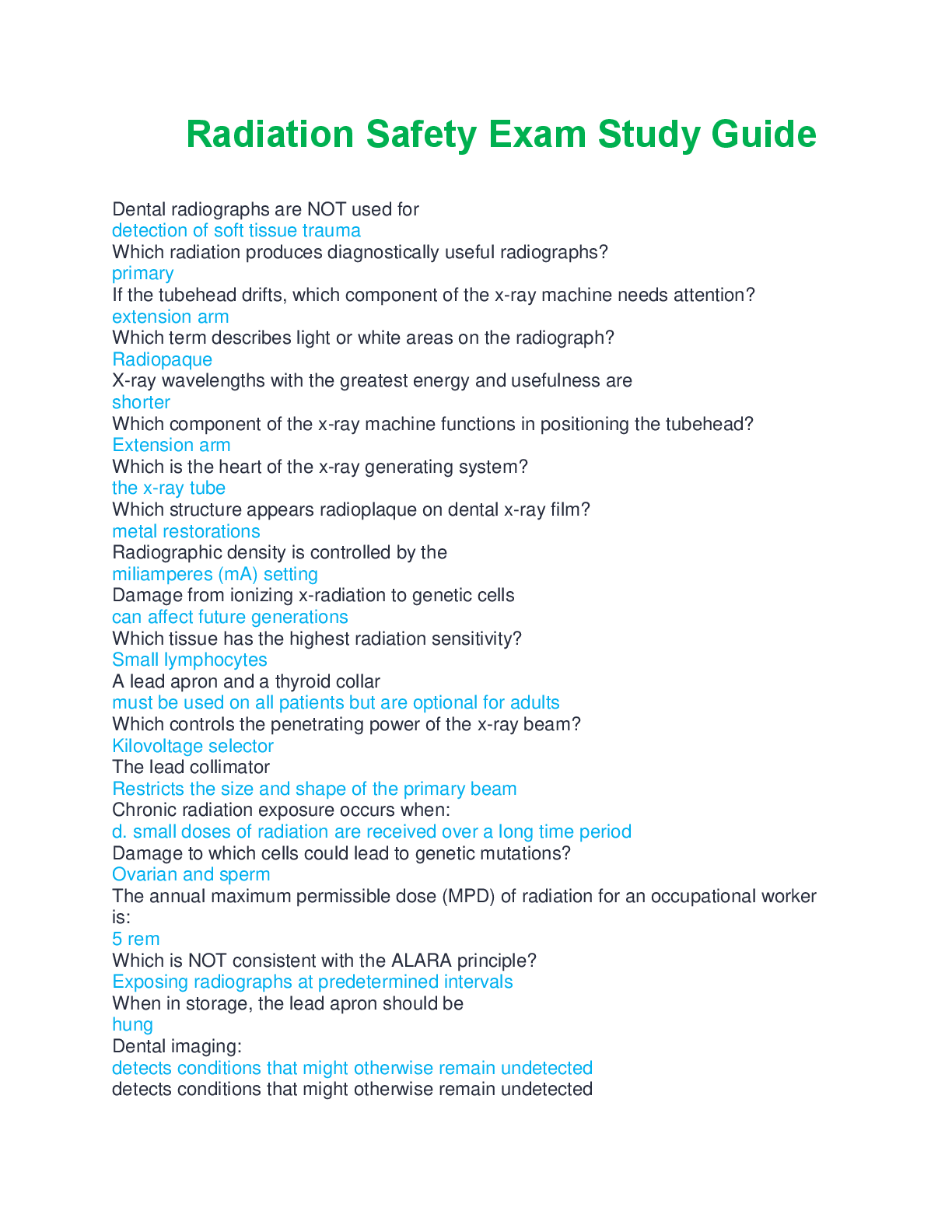 Education > EXAM > Radiation Safety Exam Study Guide questions and answers 100% complete solution 2025 (All)