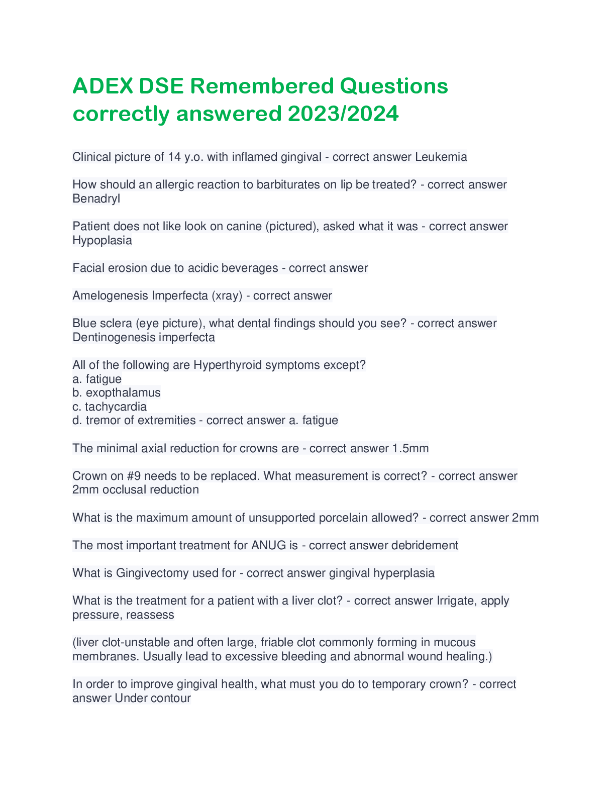 Education > EXAM > ADEX DSE Remembered Questions correctly answered 2023/2024 (All)