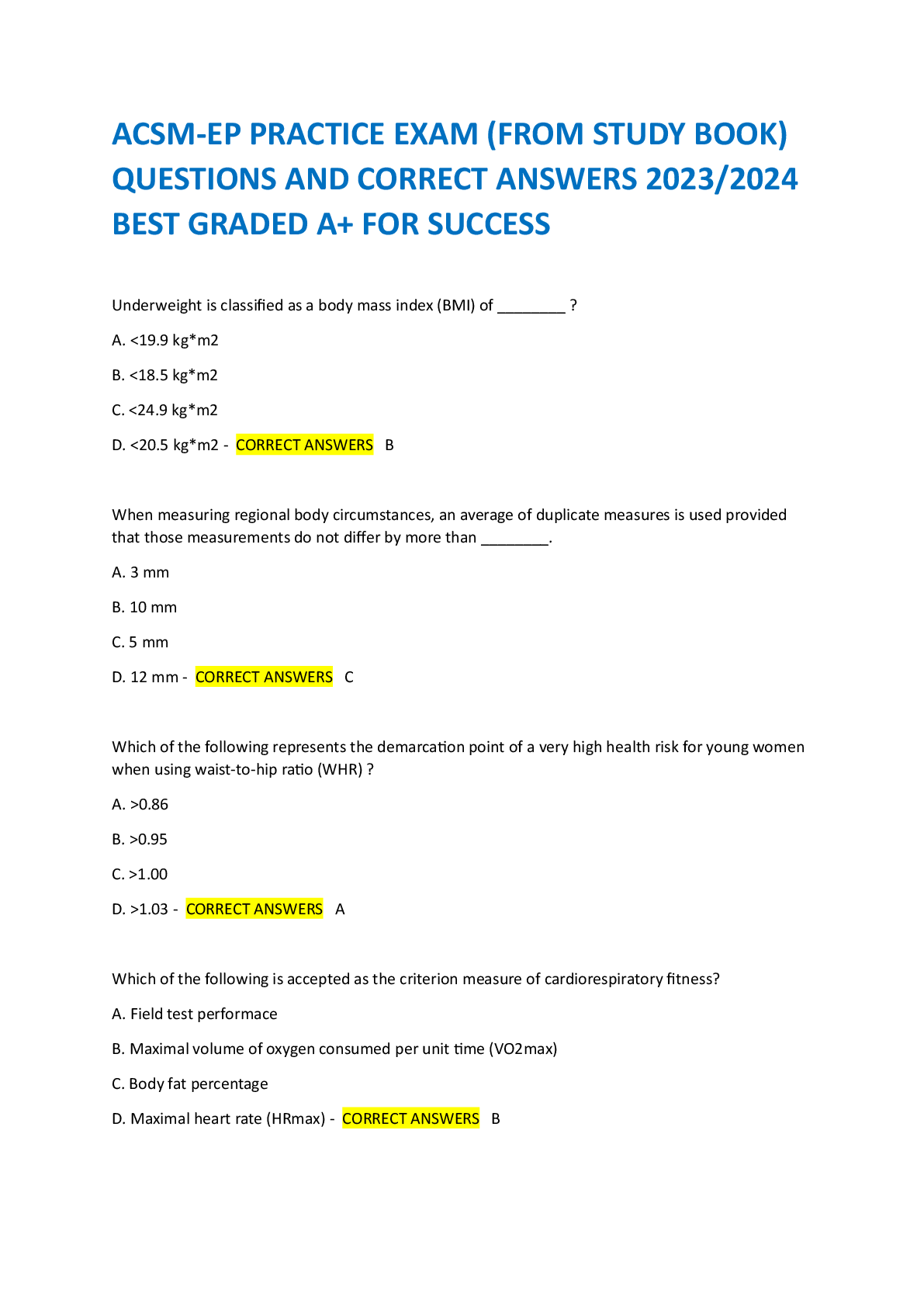Education > EXAM > ACSM-EP PRACTICE EXAM (FROM STUDY BOOK) QUESTIONS AND CORRECT ANSWERS 2023/2024 BEST GRADED A+ FOR SUCCESS (All)