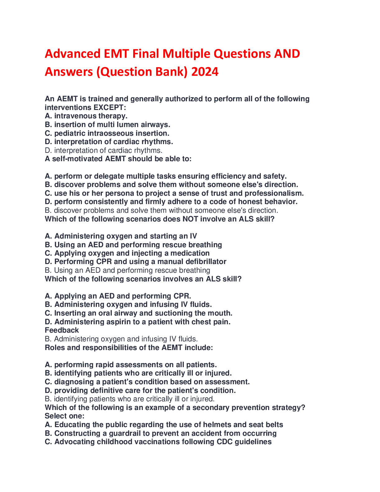 Education > EXAM > Advanced EMT Final Multiple Questions AND Answers (Question Bank) 2024 (All)