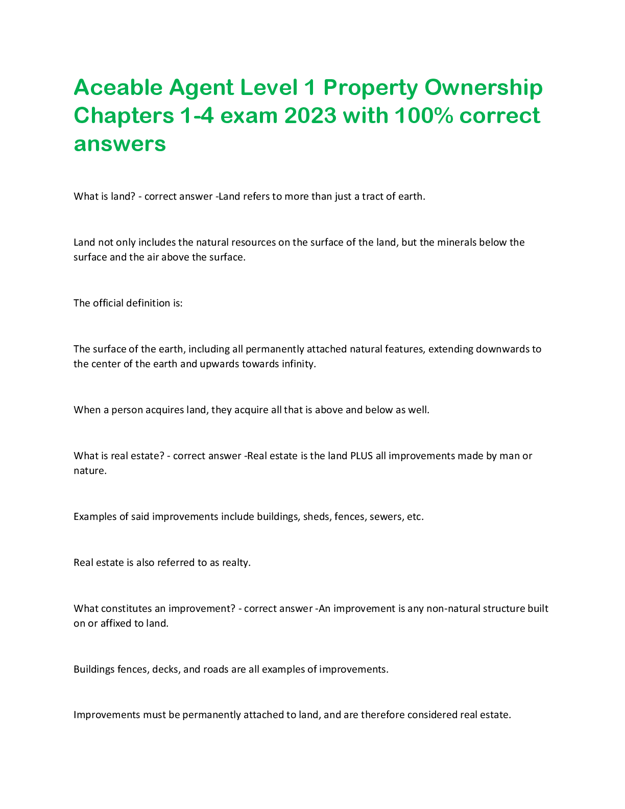 Education > EXAM > Aceable Agent Level 1 Property Ownership Chapters 1-4 exam 2023 with 100% correct answers (All)