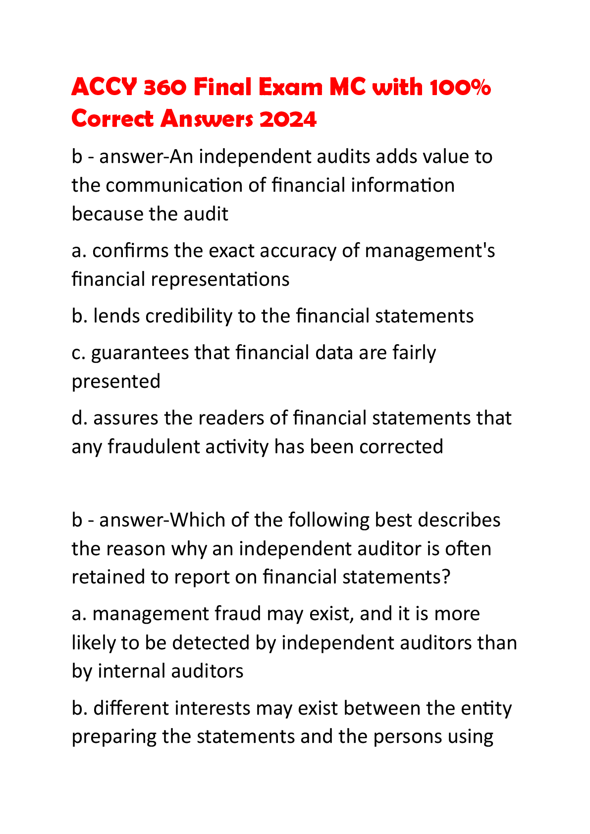 Education > EXAM > ACCY 360 Final Exam MC with 100% Correct Answers 2024 (All)
