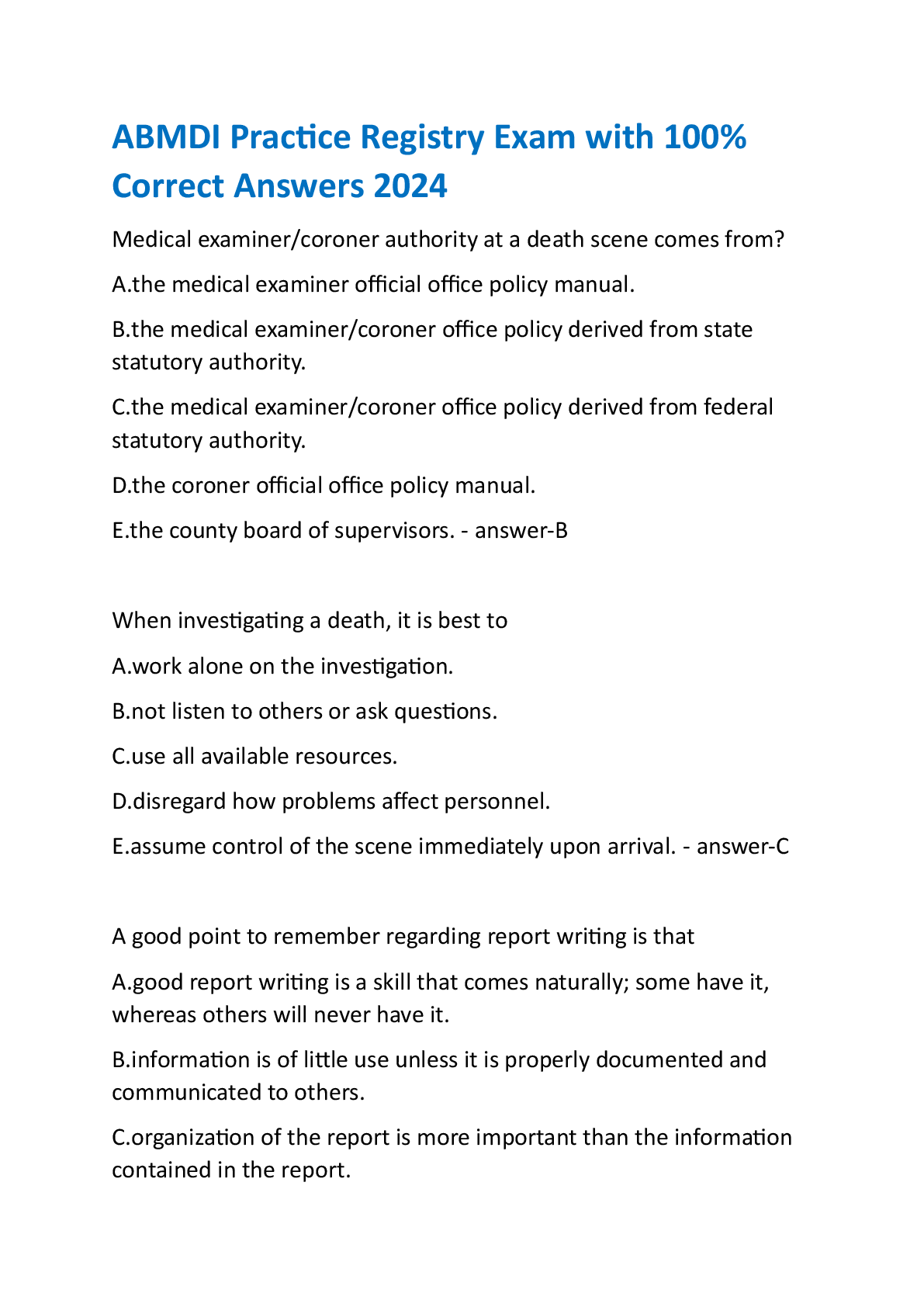 Education > EXAM > ABMDI Practice Registry Exam with 100% Correct Answers 2024 (All)