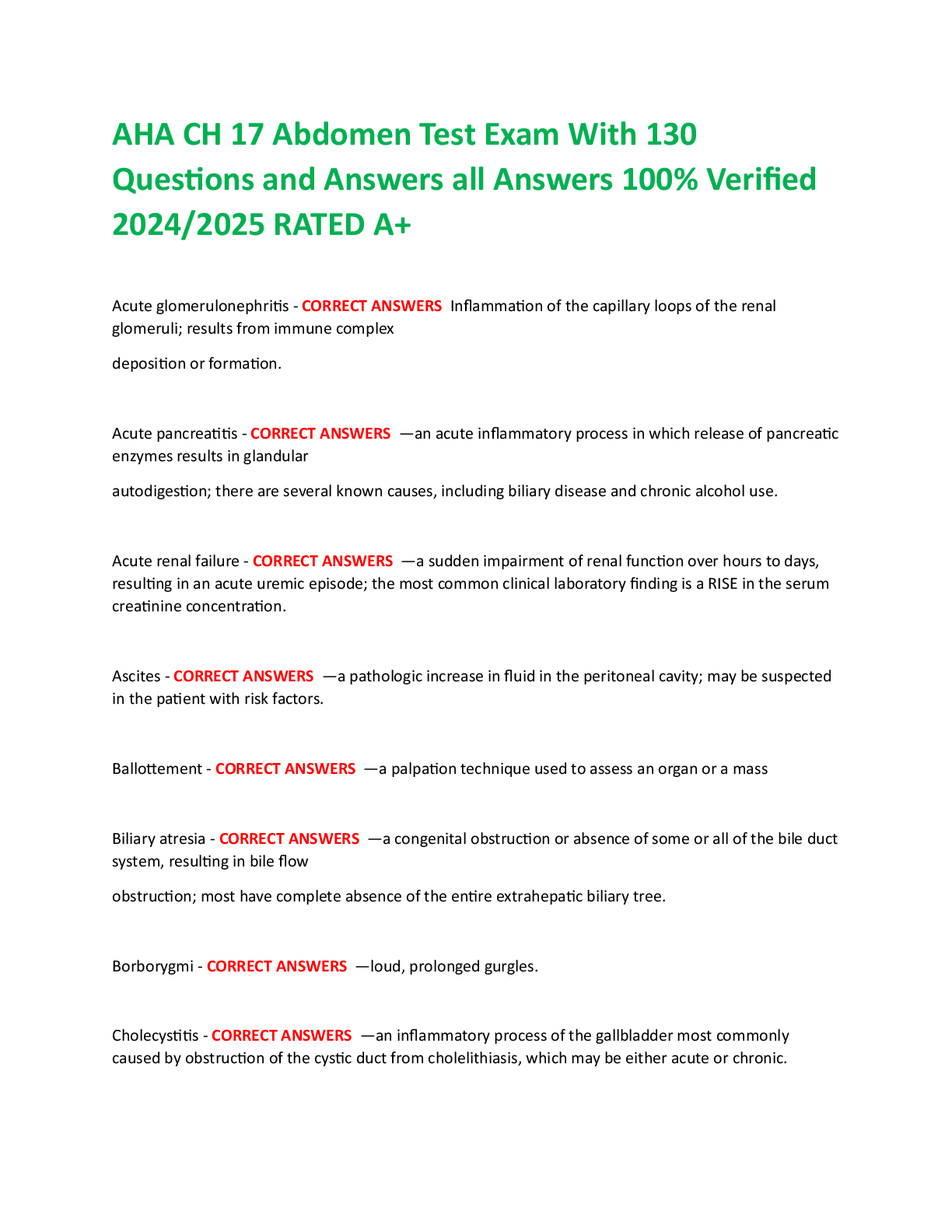 Education > EXAM > AHA CH 17 Abdomen Test Exam With 130 Questions and Answers all Answers 100% Verified 2024/2025 RATED A+ (All)