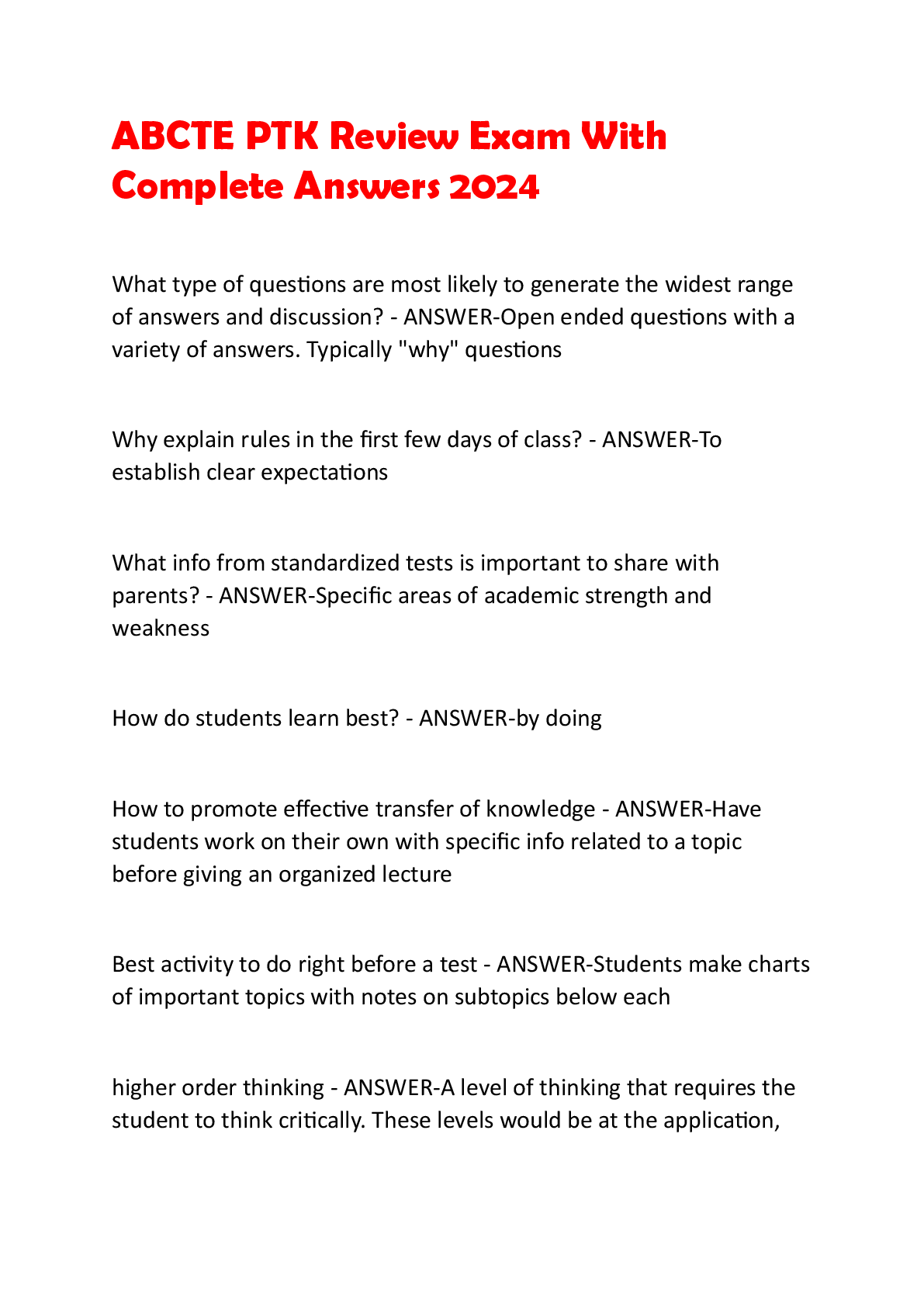Education > EXAM > ABCTE PTK Review Exam With Complete Answers 2024 (All)