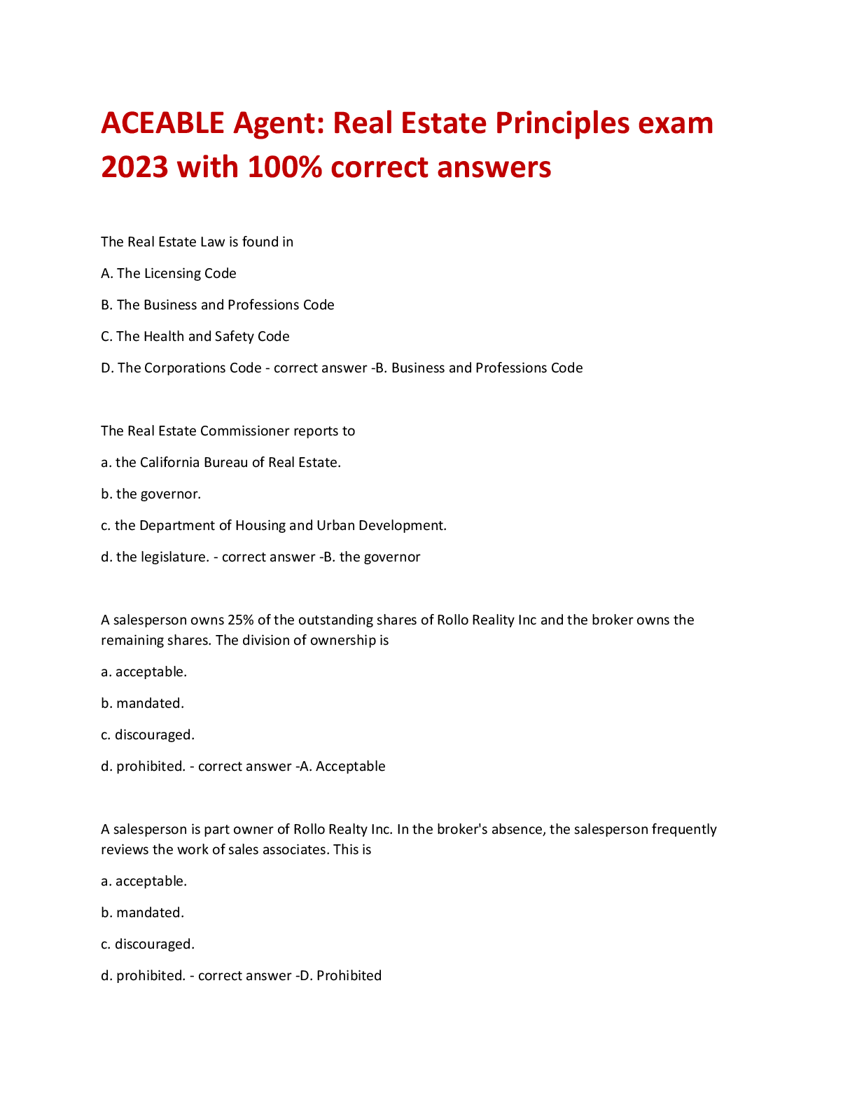 Education > EXAM > ACEABLE Agent: Real Estate Principles exam 2023 with 100% correct answers (All)