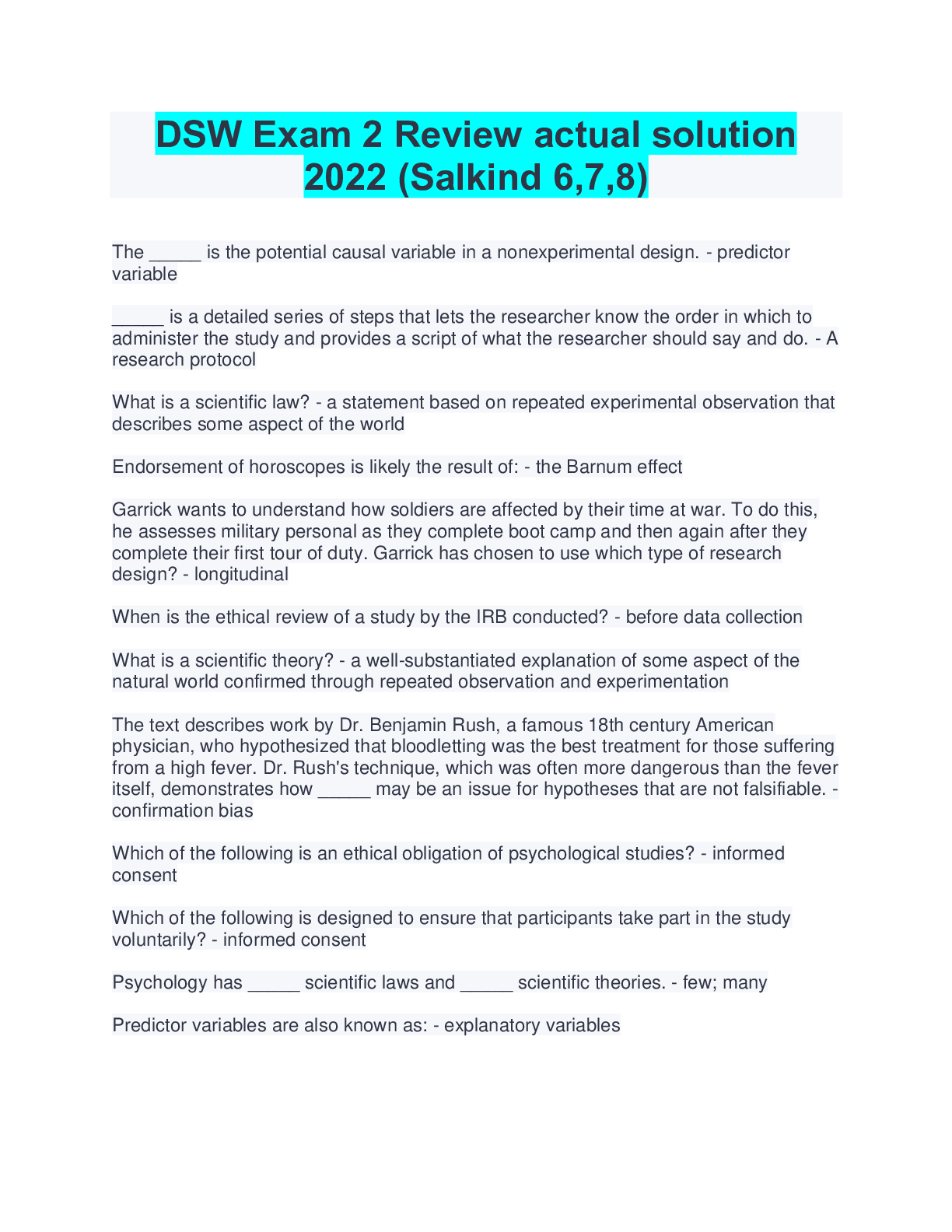 Education > QUESTIONS and ANSWERS > DSW Exam 2 Review actual solution 2022 (Salkind 6,7,8) (All)