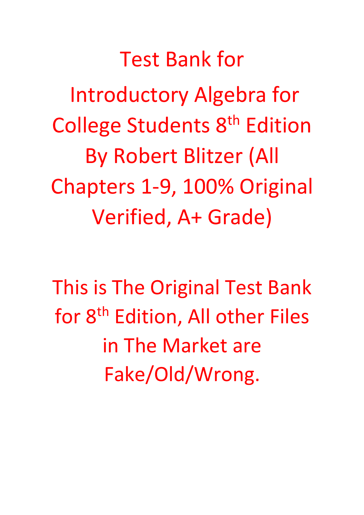 Education > TEST BANKS > Test Bank For Introductory Algebra for College Students 8th Edition By Robert Blitzer (All)