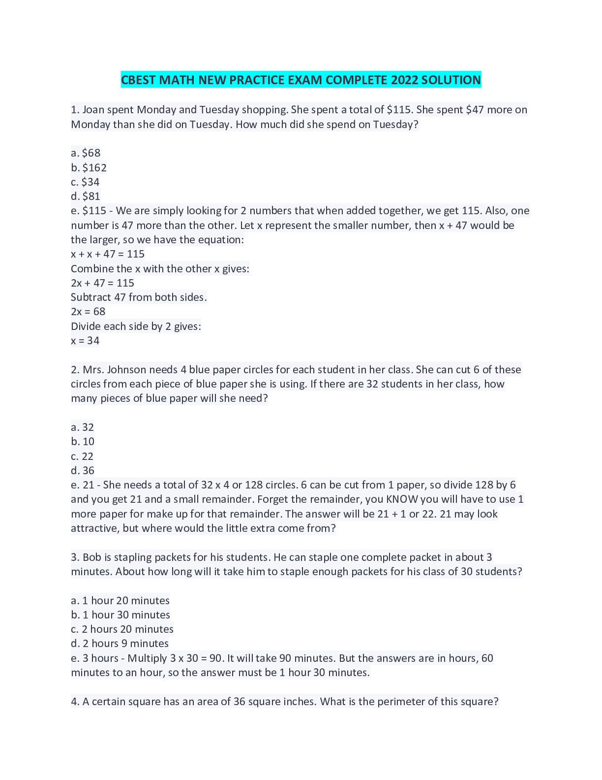 Education > EXAM > CBEST MATH NEW PRACTICE EXAM COMPLETE 2022 SOLUTION (All)