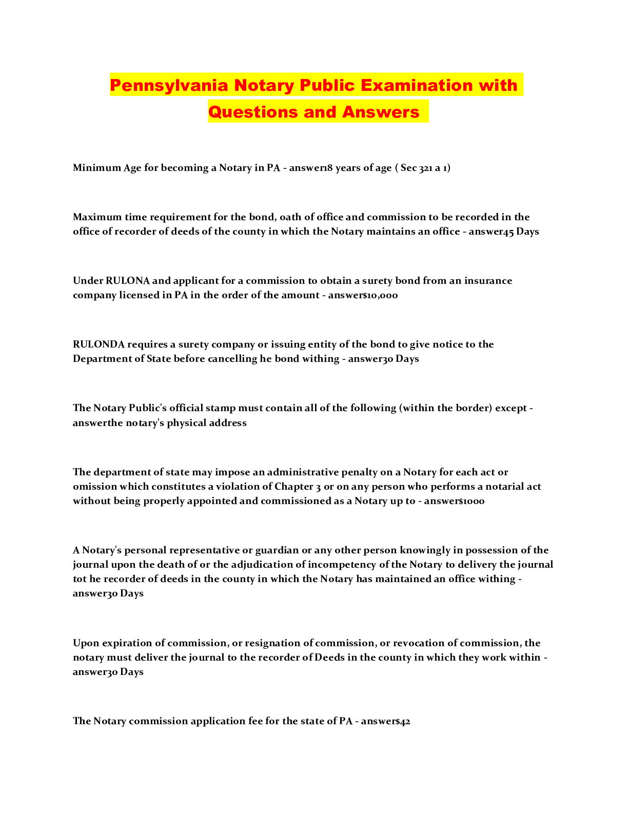 Education > QUESTIONS & ANSWERS > Pennsylvania Notary Public Examination with Questions and Answers (All)