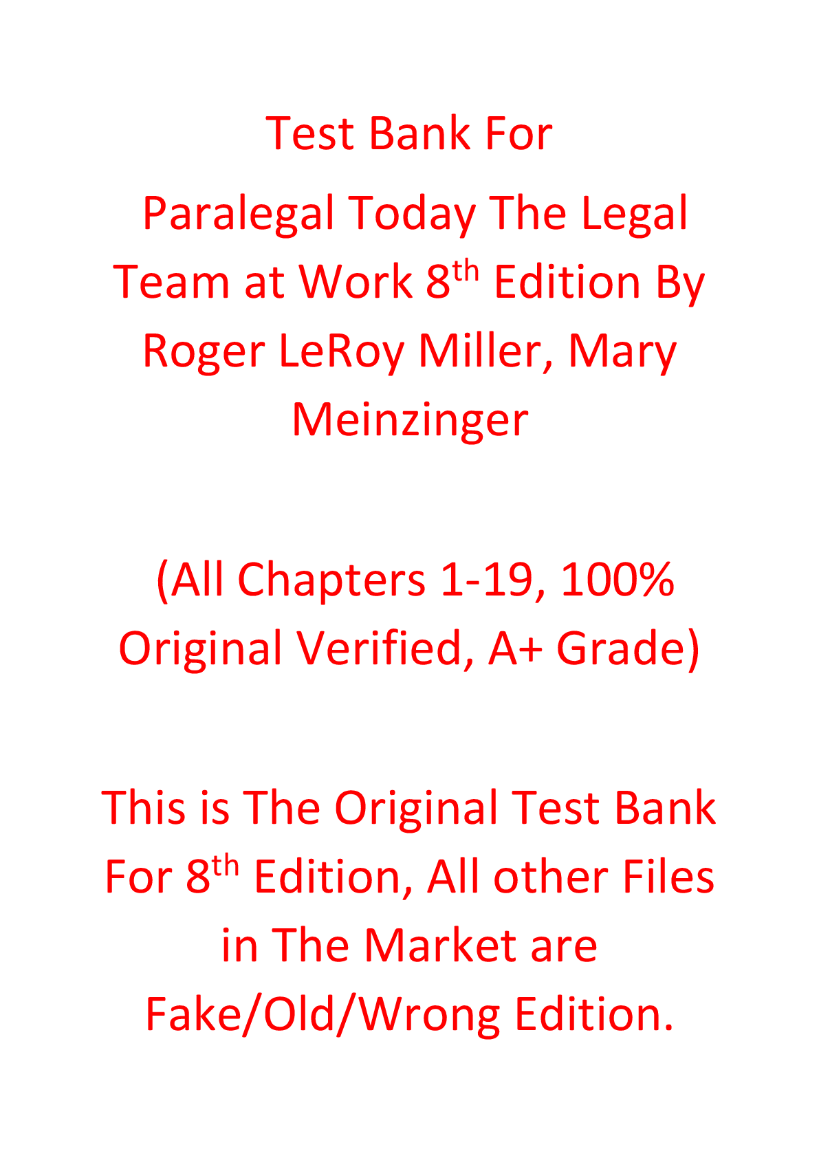 Education > TEST BANKS > Test Bank For Paralegal Today The Legal Team at Work 8th Edition By Roger LeRoy Miller, Mary Meinzinger (All)