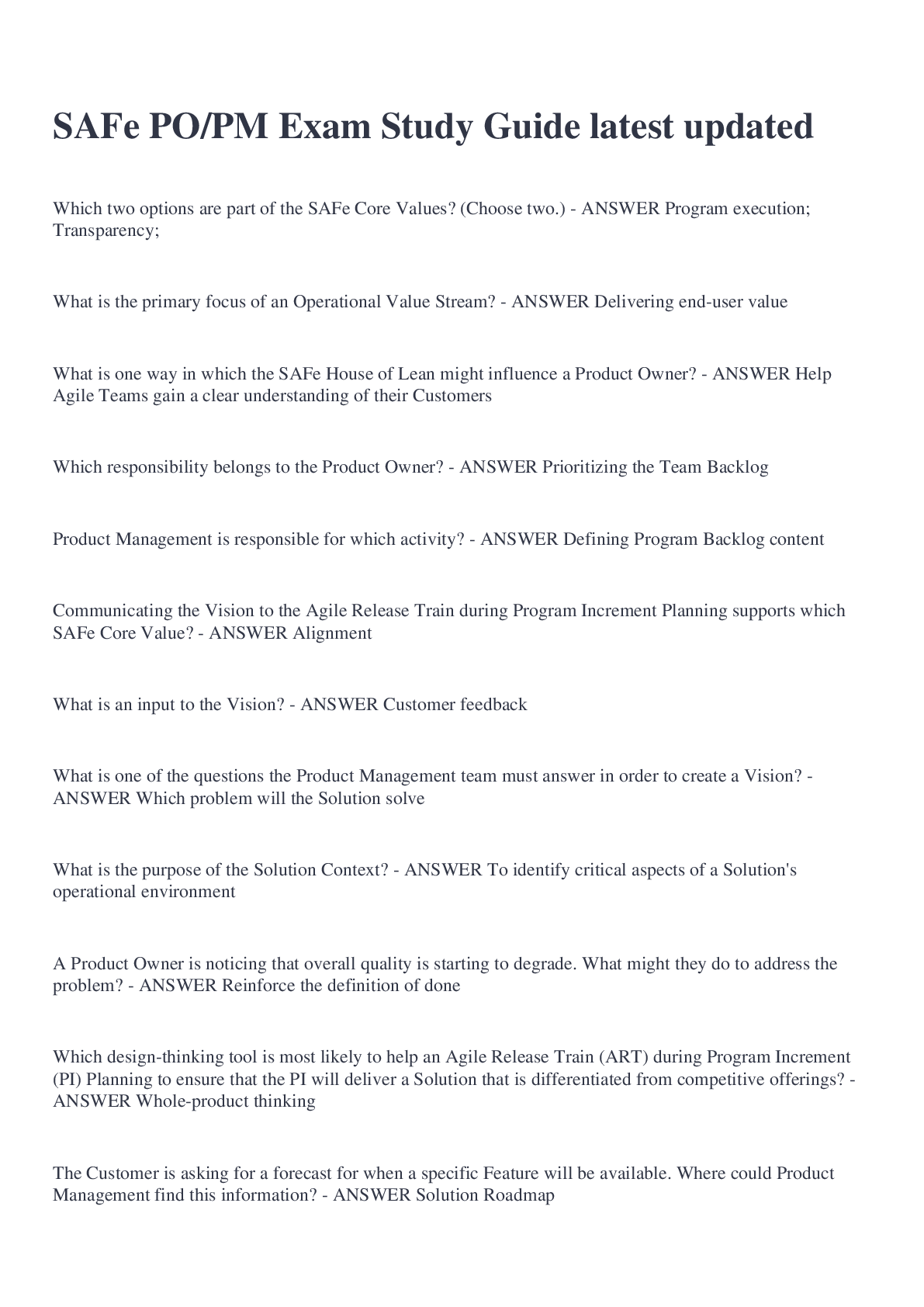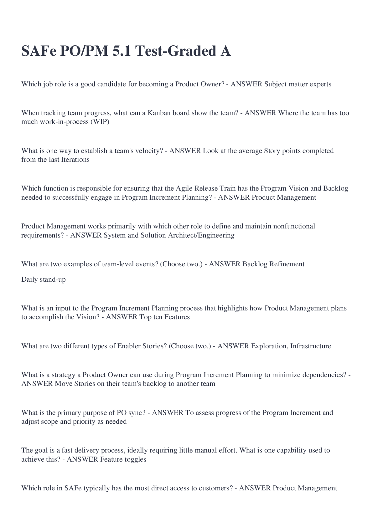 Education > EXAM > PO/PM SAFe Practice Exam 2022/2023 Questions and Answers (All)