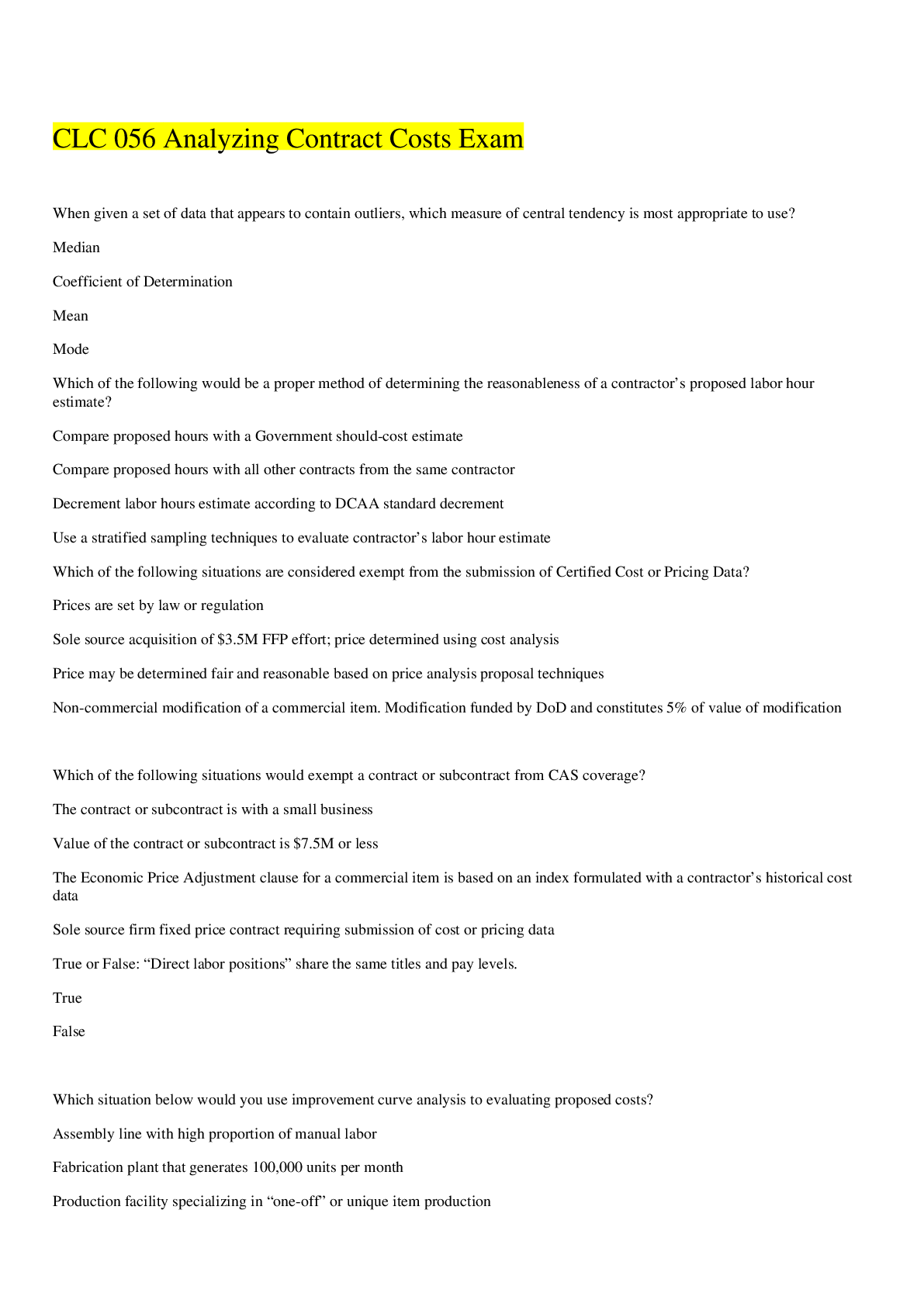 Education > EXAM > CLC 056 Analyzing Contract Costs Exam 100% correct (All)