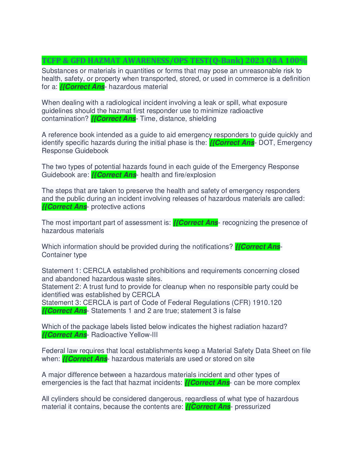Education > EXAM > TCFP & GFD HAZMAT AWARENESS/OPS TEST(Q-Bank) 2023 Q&A 100% (All)