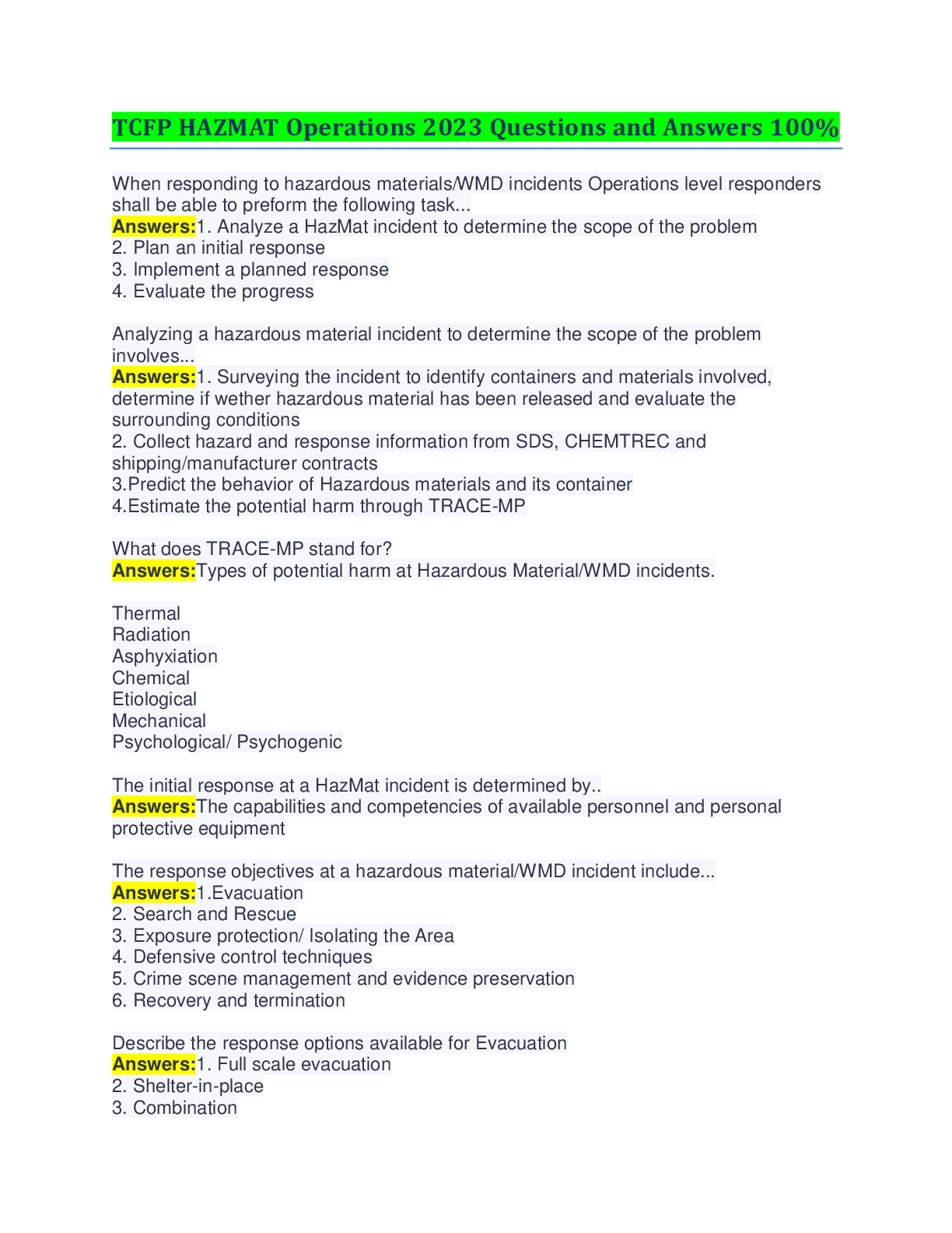 Education > EXAM > TCFP HAZMAT Operations 2023 Questions and Answers 100% (All)