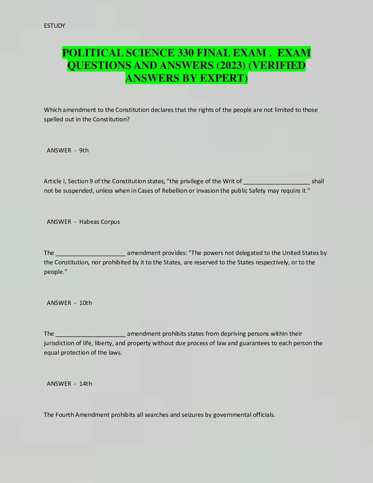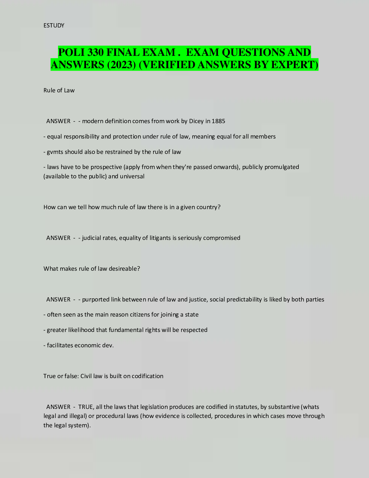 Education > EXAMs > POLITICAL SCIENCE 330 FINAL EXAM . EXAM QUESTIONS AND ANSWERS (2023) (VERIFIED ANSWERS BY EXPERT) (All)
